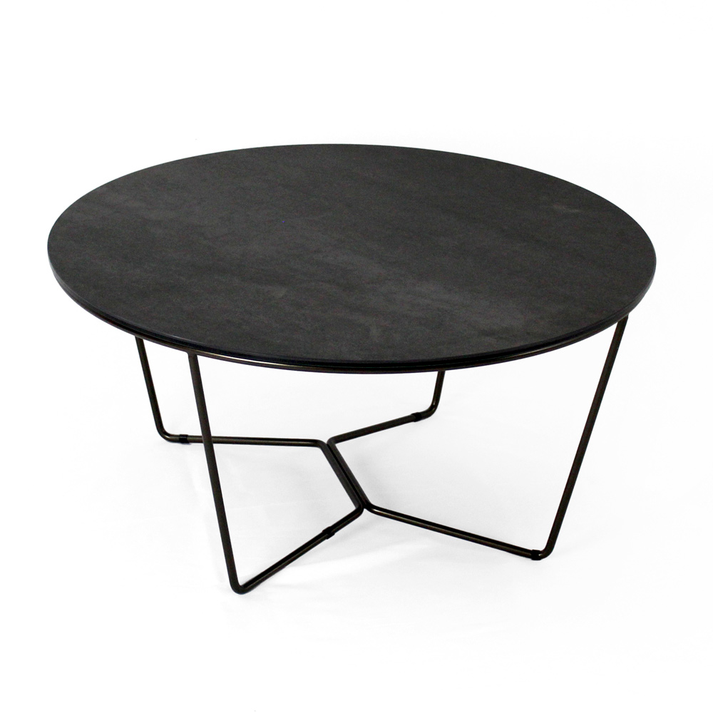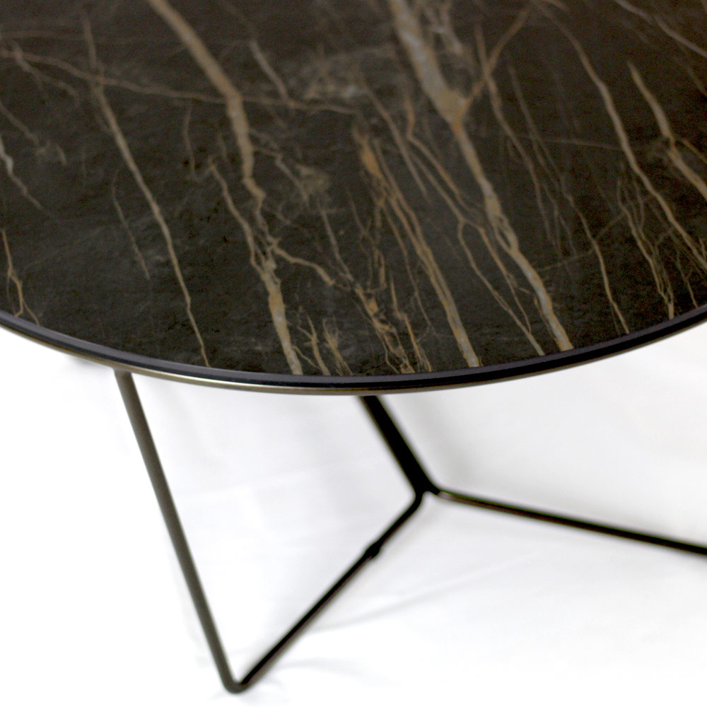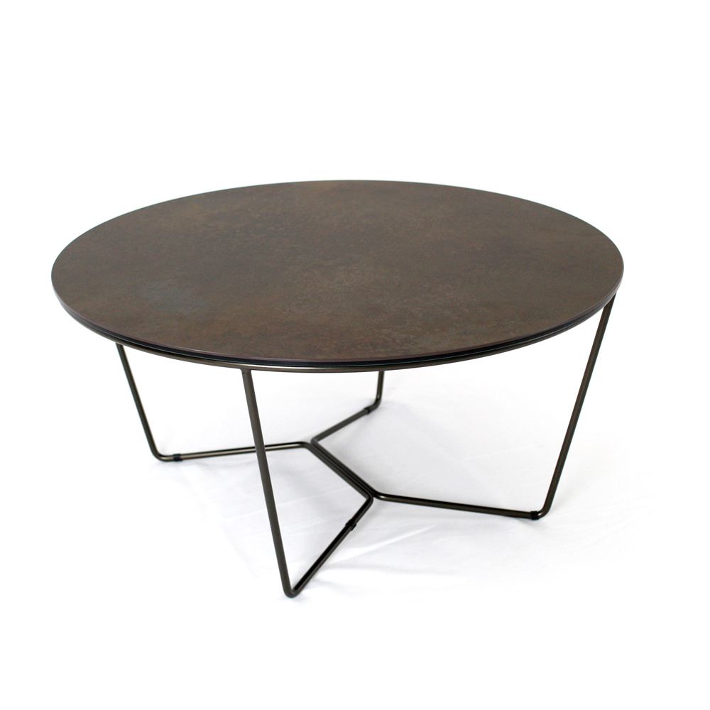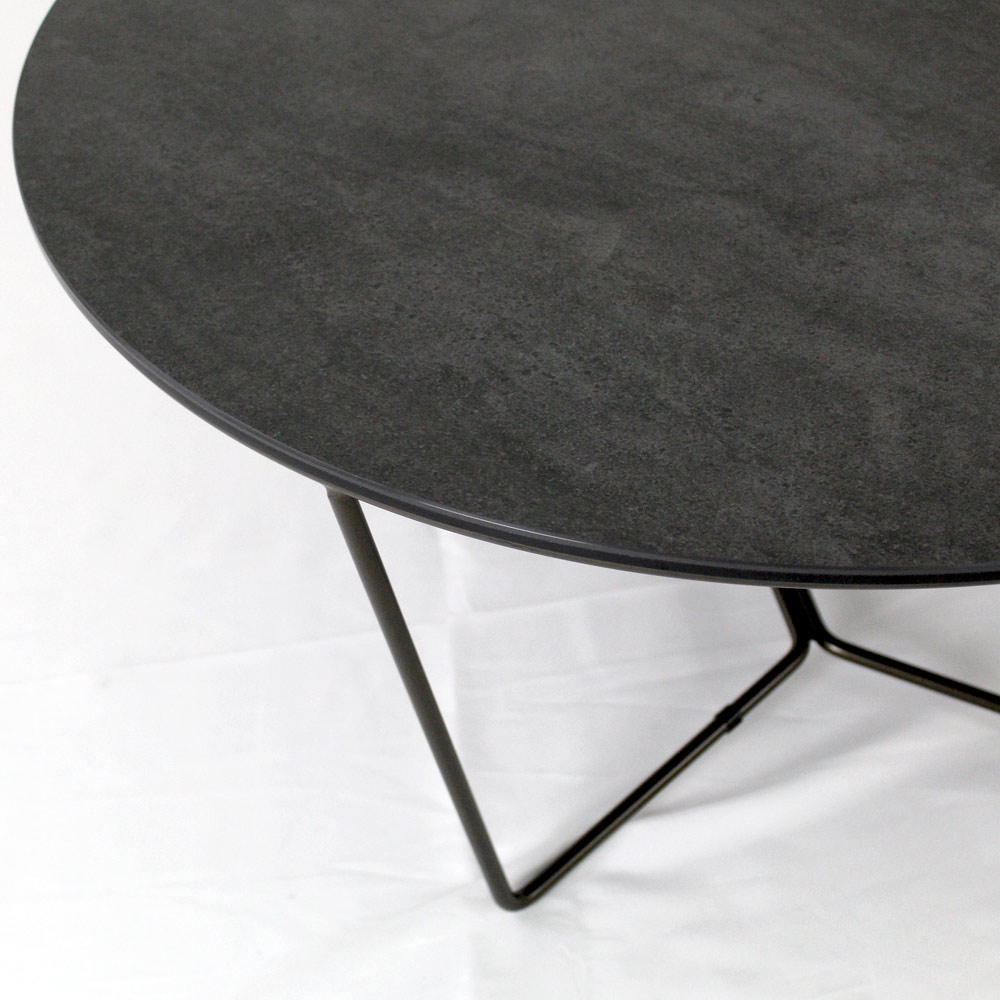 Round coffee table with painted steel base and porcelain stoneware top.