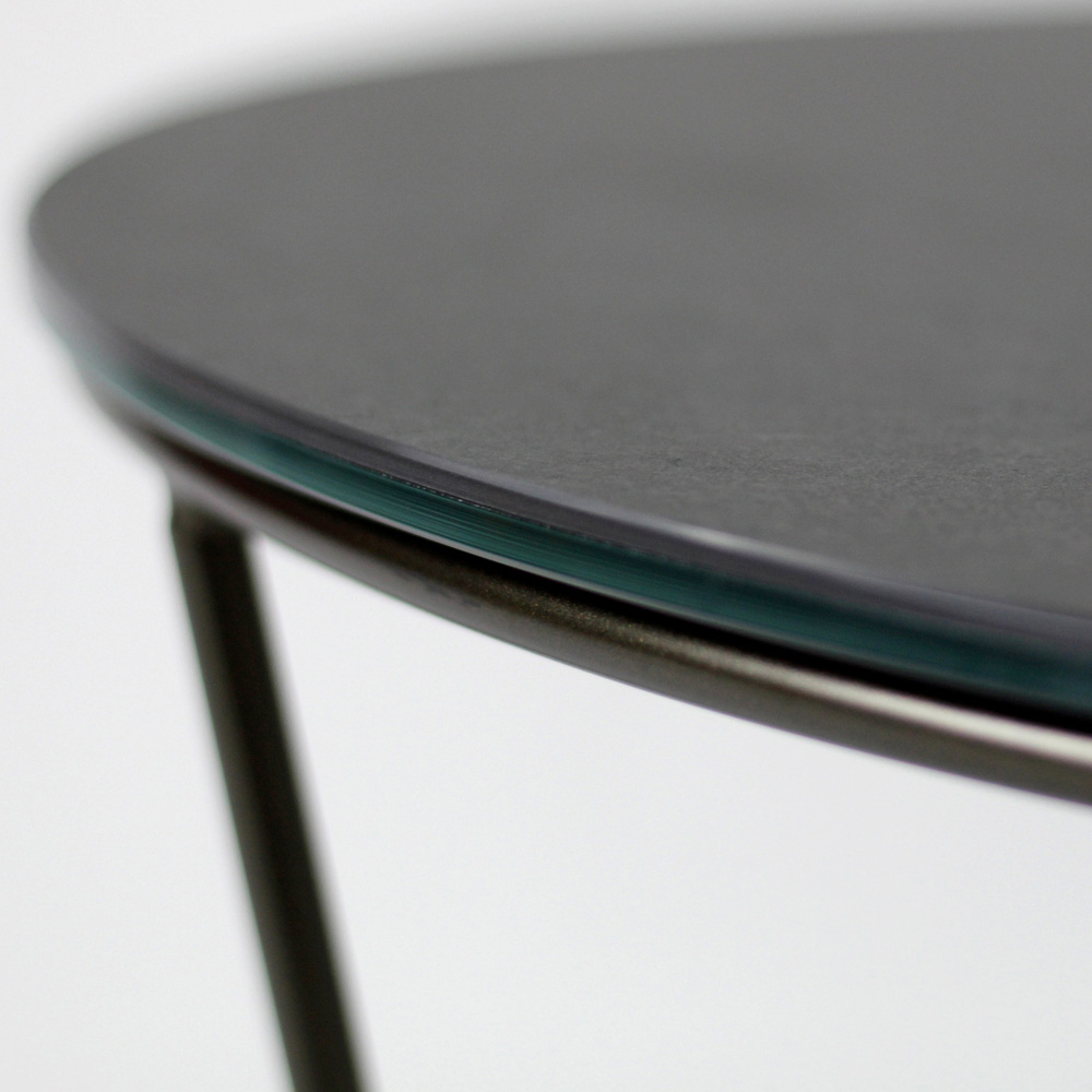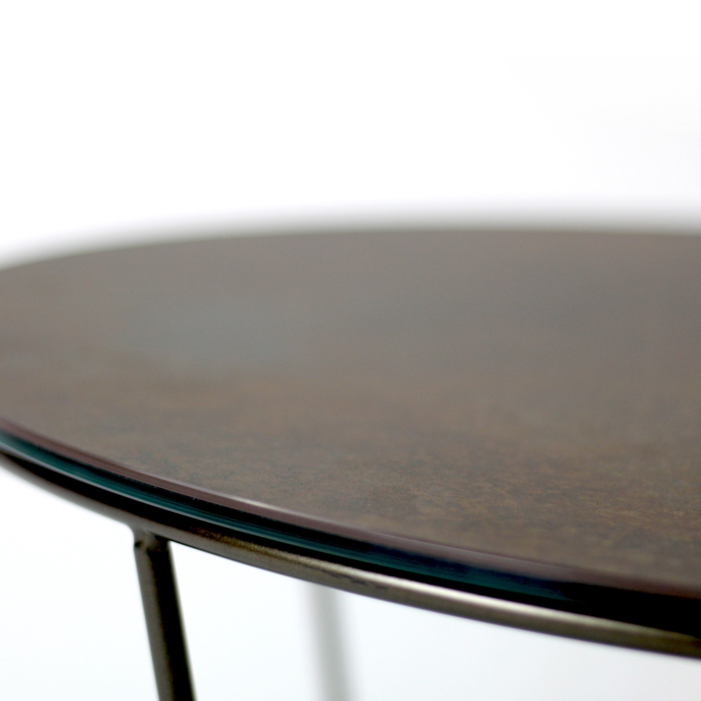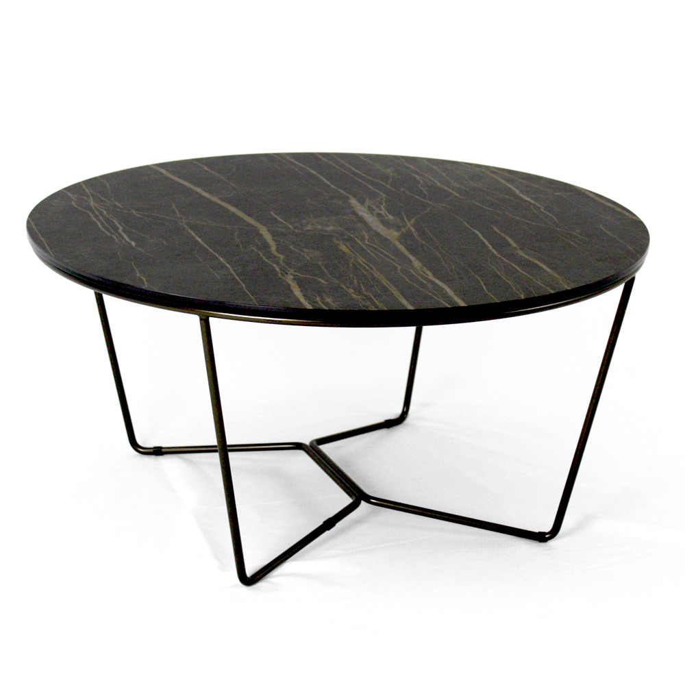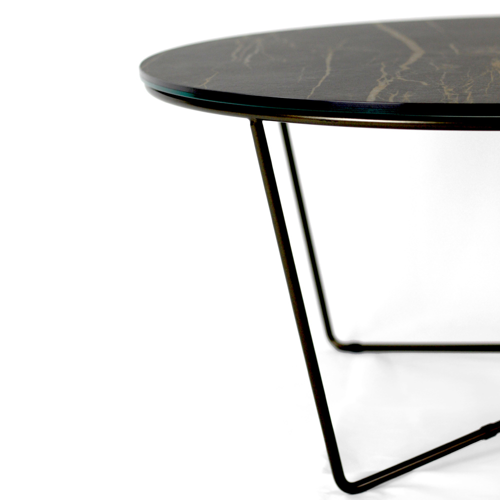 Round coffee table with painted steel base and porcelain stoneware top.