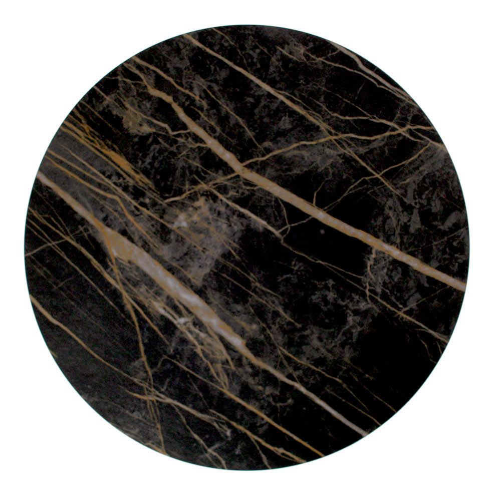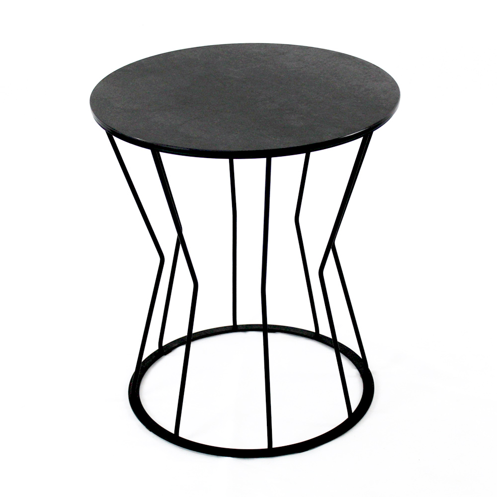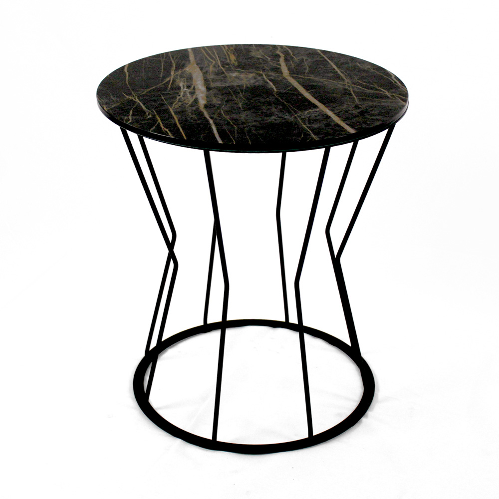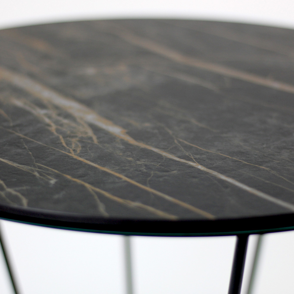 Round coffee table with painted steel base and porcelain stoneware top.