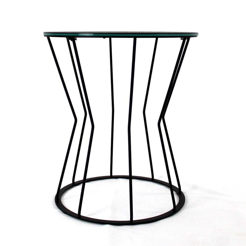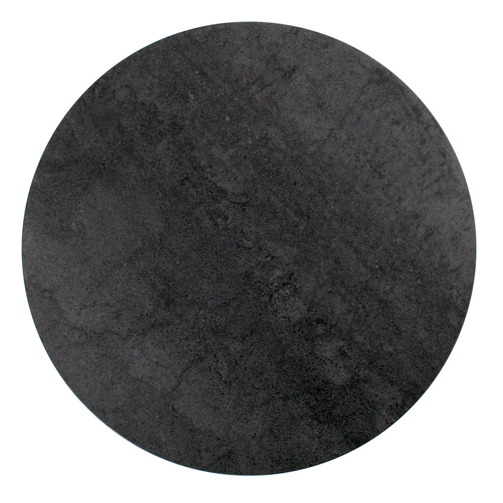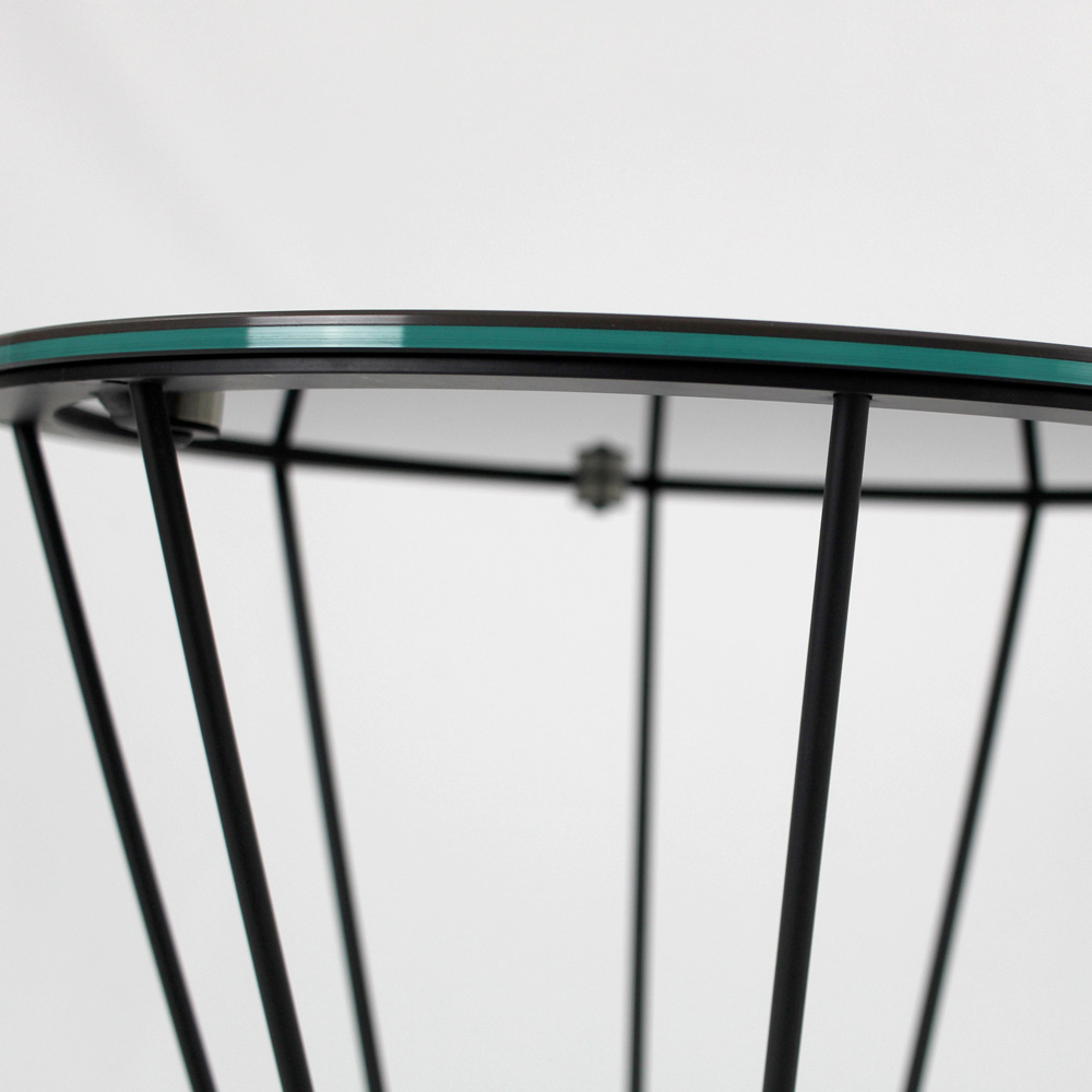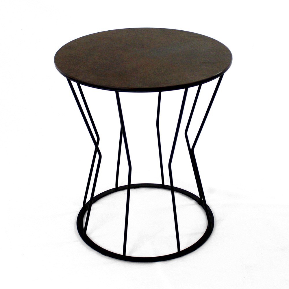 Round coffee table with painted steel base and porcelain stoneware top.