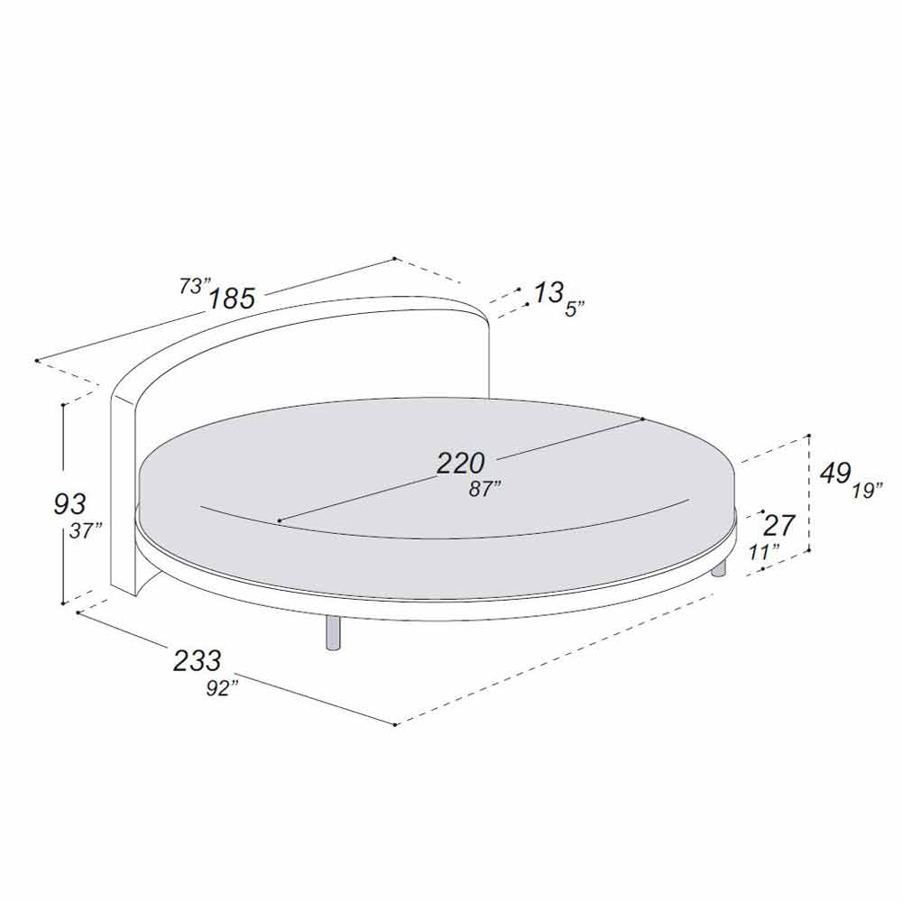 Round double bed with a unique and refined design characterized by an unusual shape and a rounded headboard that allows it to be used in the center of the room, but also against the wall.