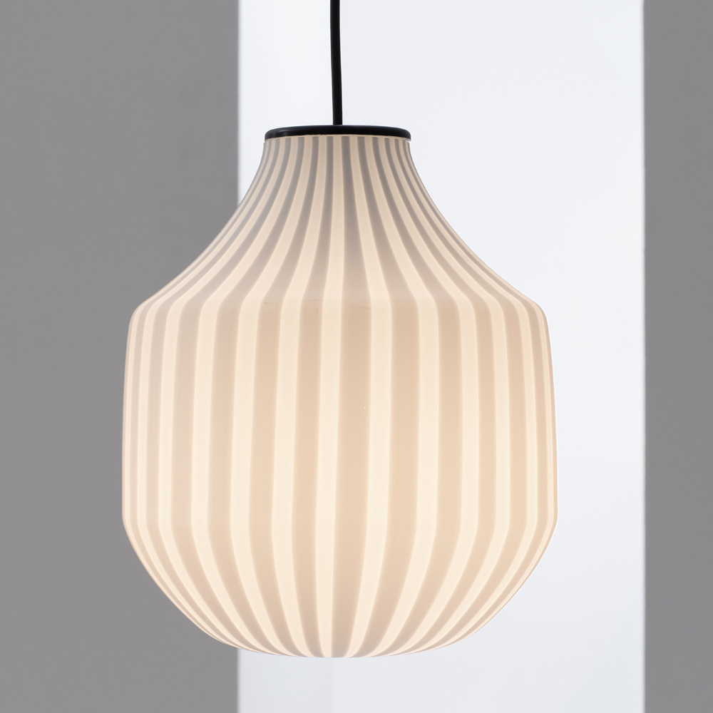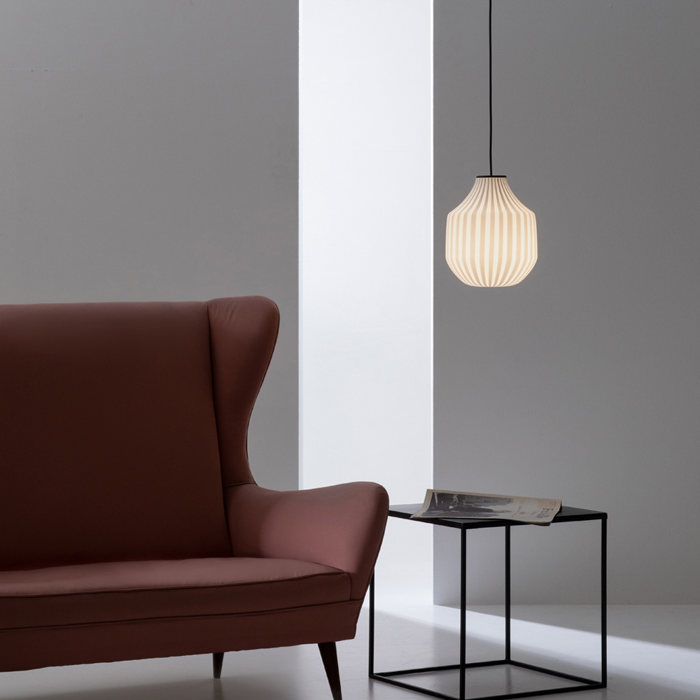 The lamp is made with a white filigree glass diffuser through craftsmanship , a material that grants luster and modernity to the light, which passes through it creating sublime and engaging atmospheres, and a removable aluminum base.