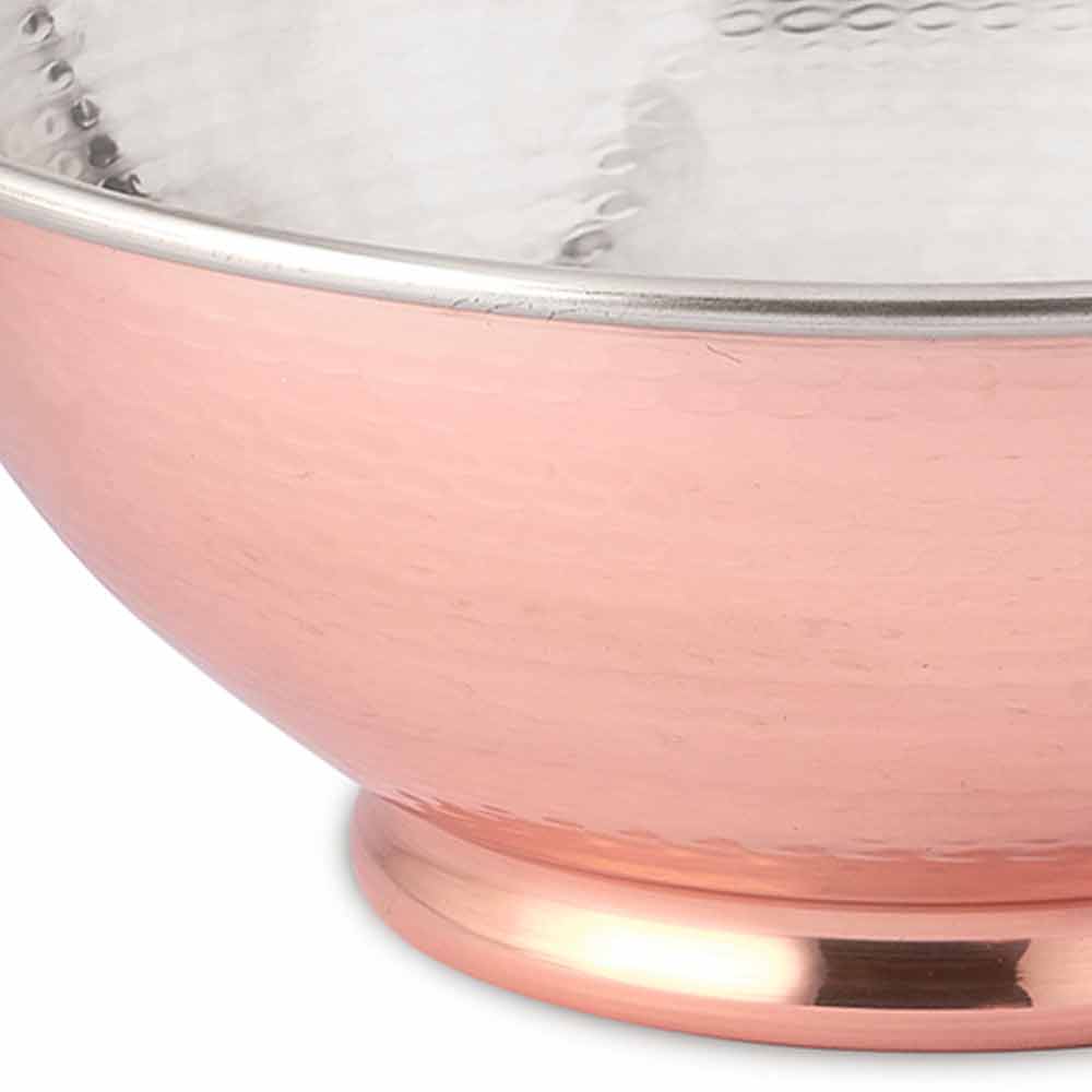 Round salad bowl in hammered polished copper of handcrafted design made in Italy.