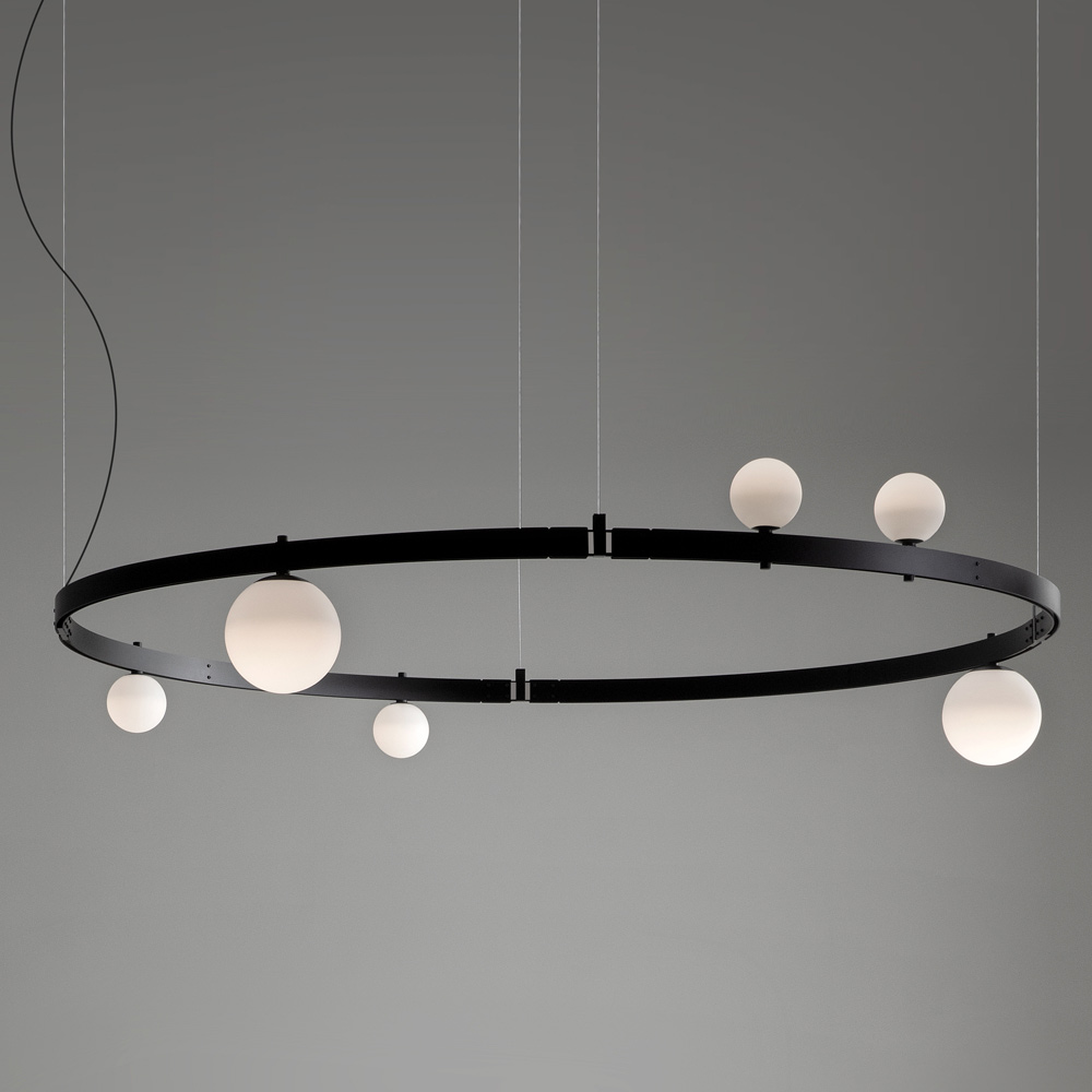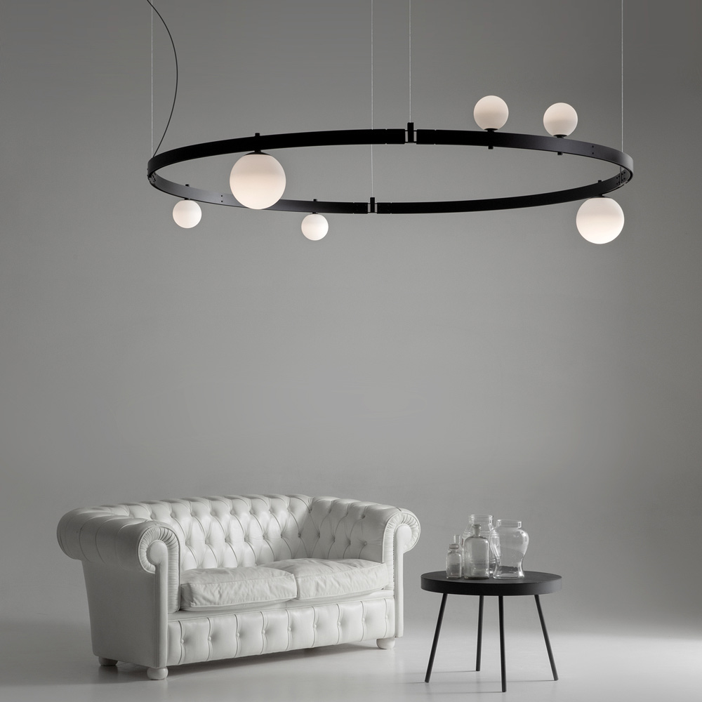 The circular bearing bar recalls the engineering structures of the past and the electrified modular structures support lighting bodies ( blown glass spheres of two different sizes) that can be placed in quantity and free arrangement, without the use of electrical power cables, for maximum freedom of expression.