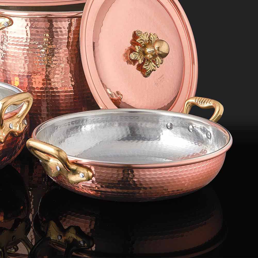 materials of excellent quality. So the copper used is pure copper, with the right physical qualities for perfect modeling. The brass for the handles comes from individual first choice ingots for artisanal casting and the tin used is 100% pure virgin suitable for food use, in compliance with the regulations and with a certificate of analysis.
