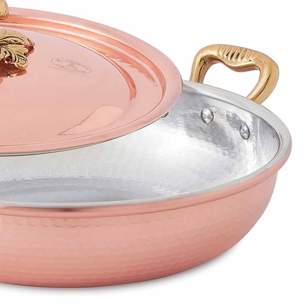 Round pan in tinned and hand hammered copper with lid, made in Italy design.