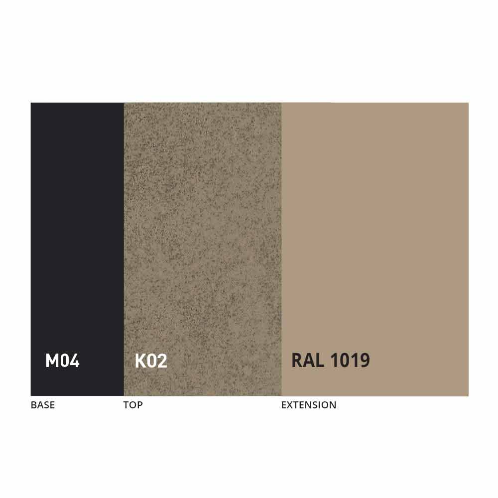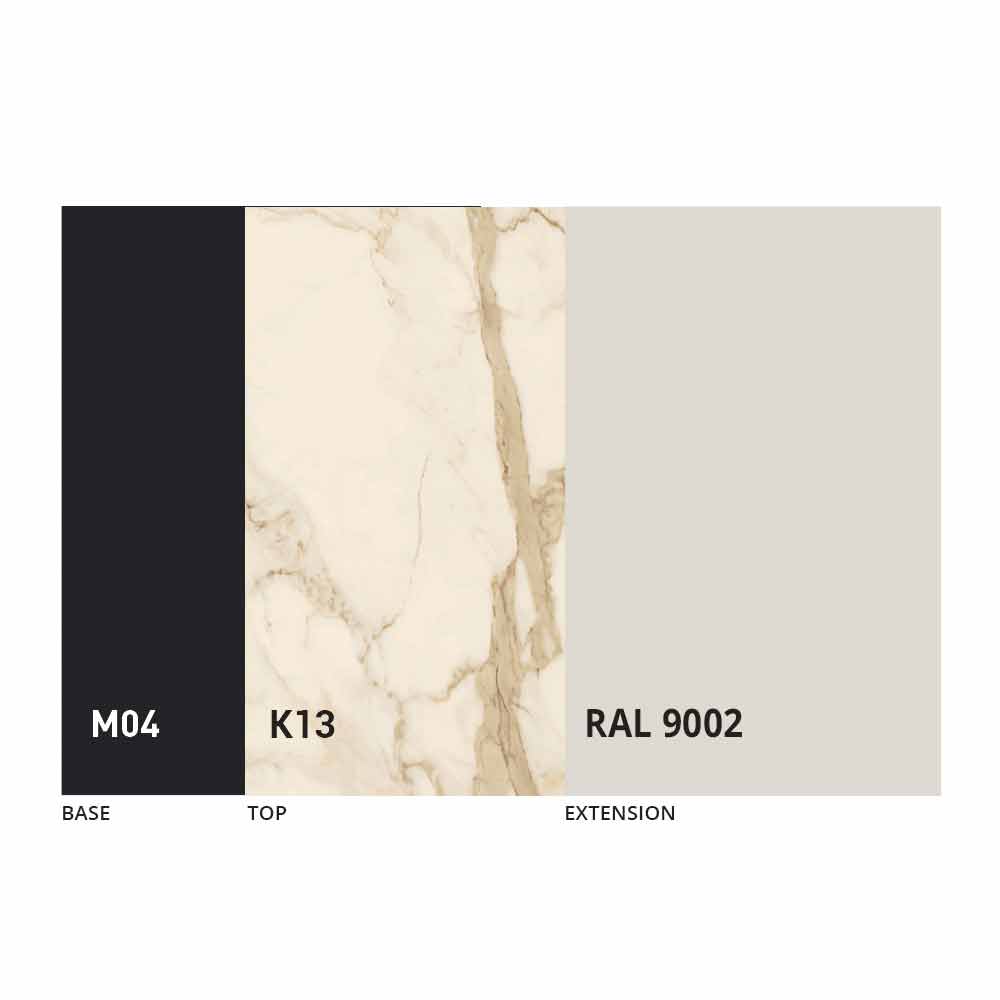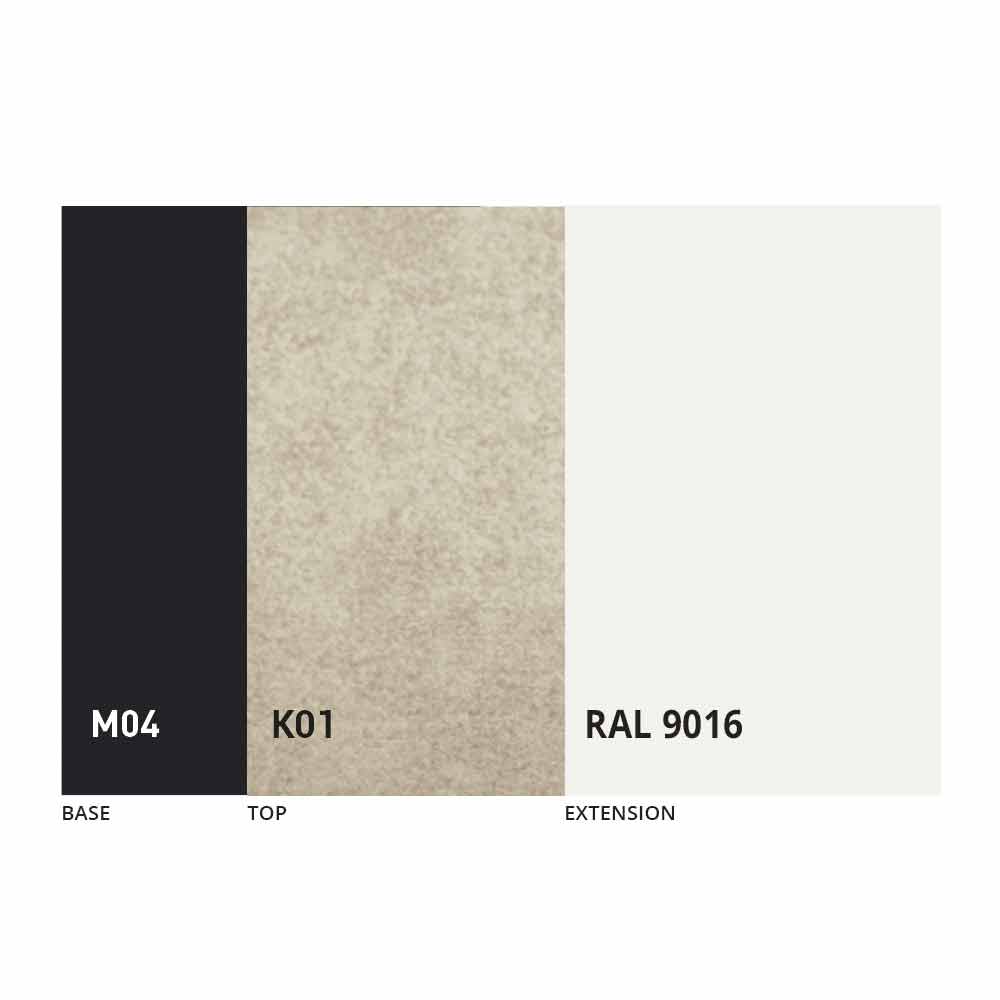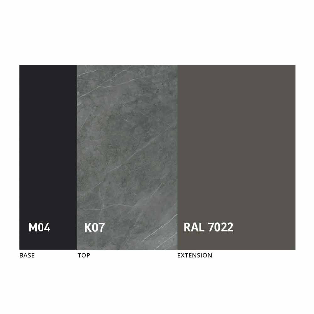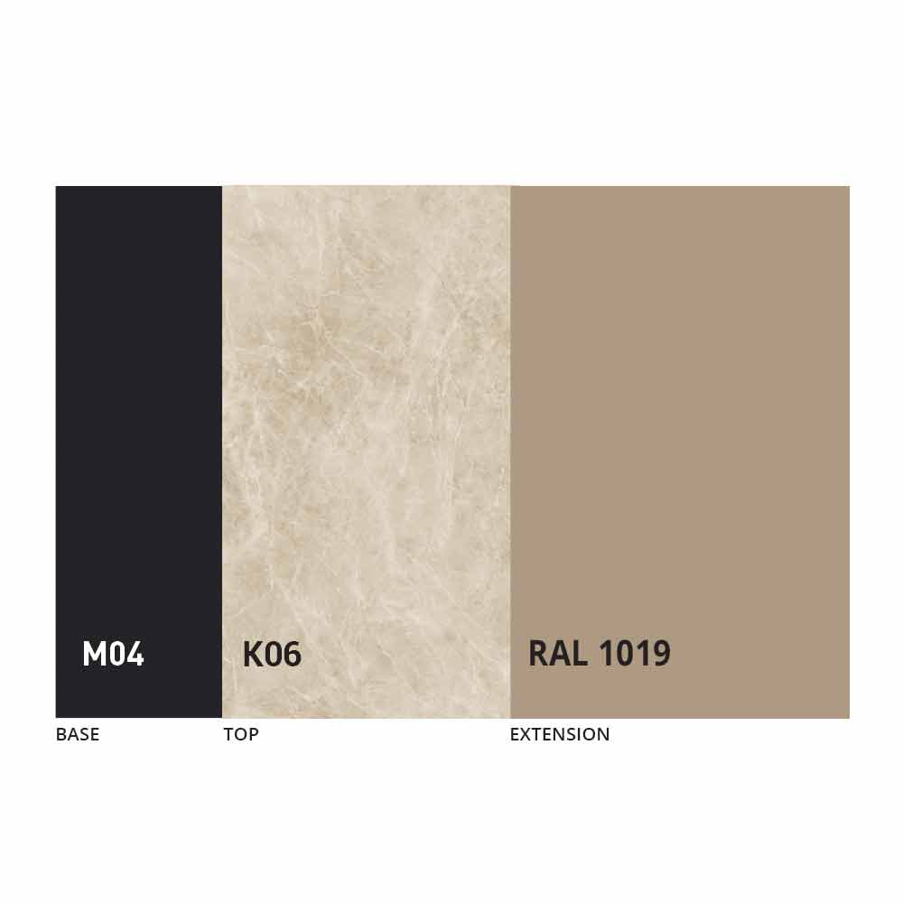 The top and base of the table can be customized with different materials and sample finishes or RAL lacquering. For information, contact us using the appropriate " Request Information" form.