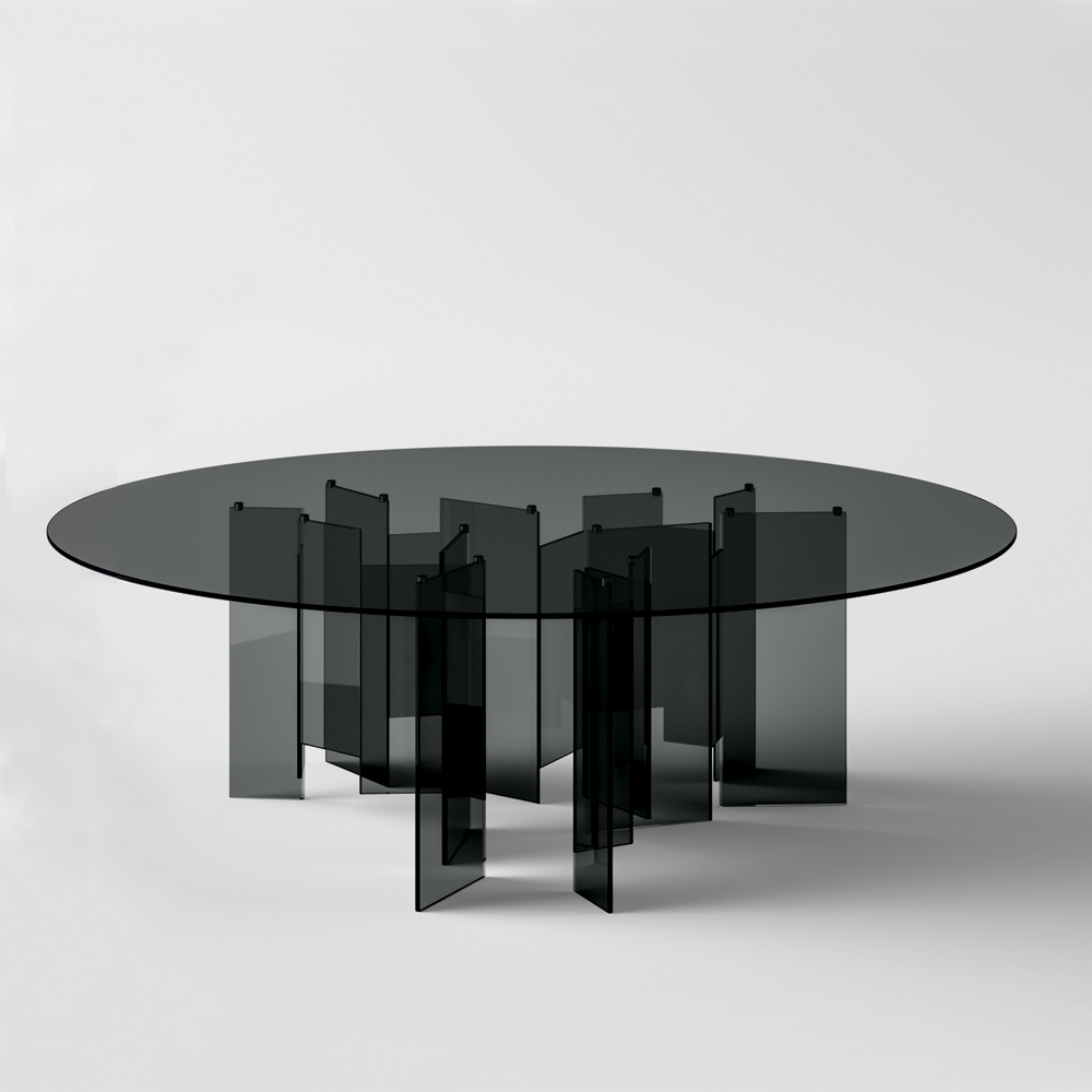 Dining table completely made of glass with basis of shapes geometric which supports an elegant round top . A furnishing solution that comes from a Made in Italy production process through the expert processing of glass by skilled craftsmen who allow to give life to the perfect combination of quality , design and functionality .