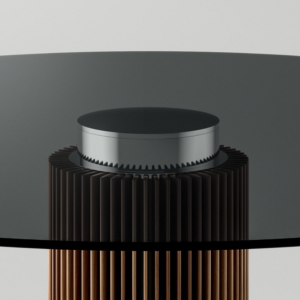 Round dining table with smoked glass top and wooden base Made in Italy.