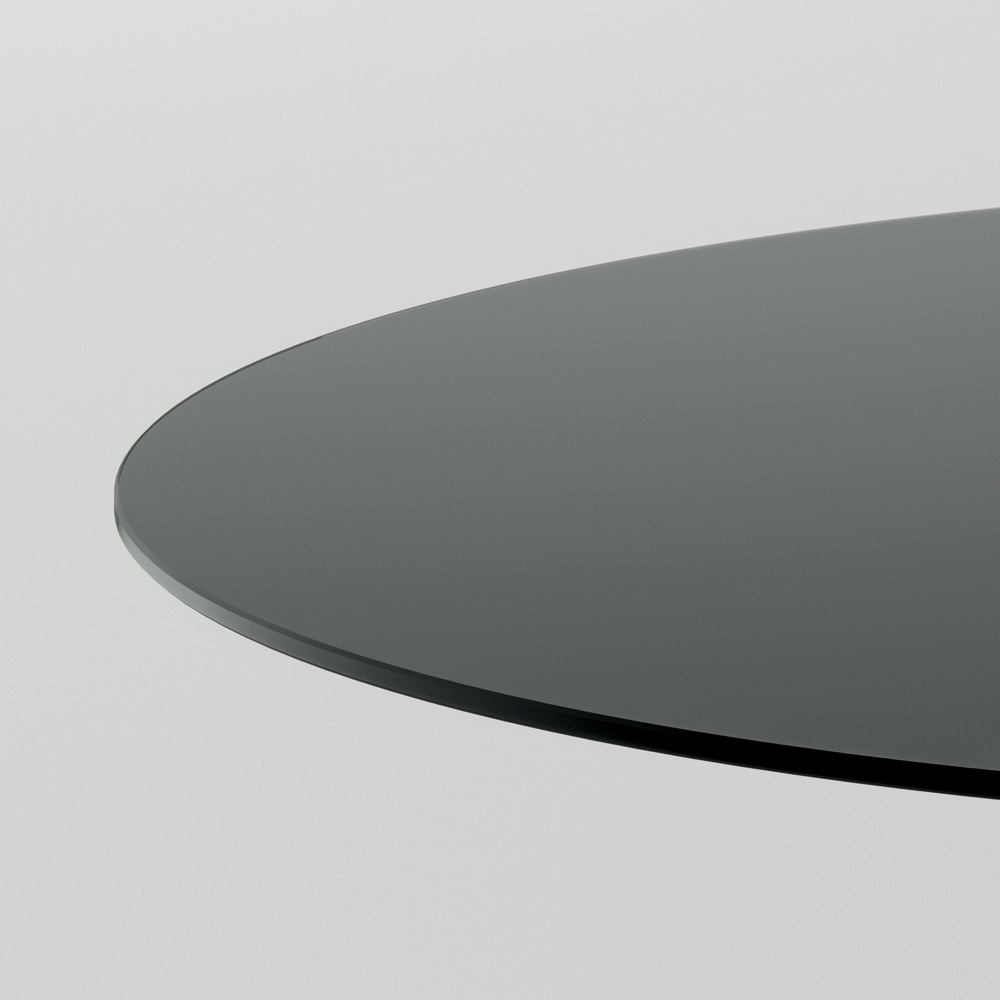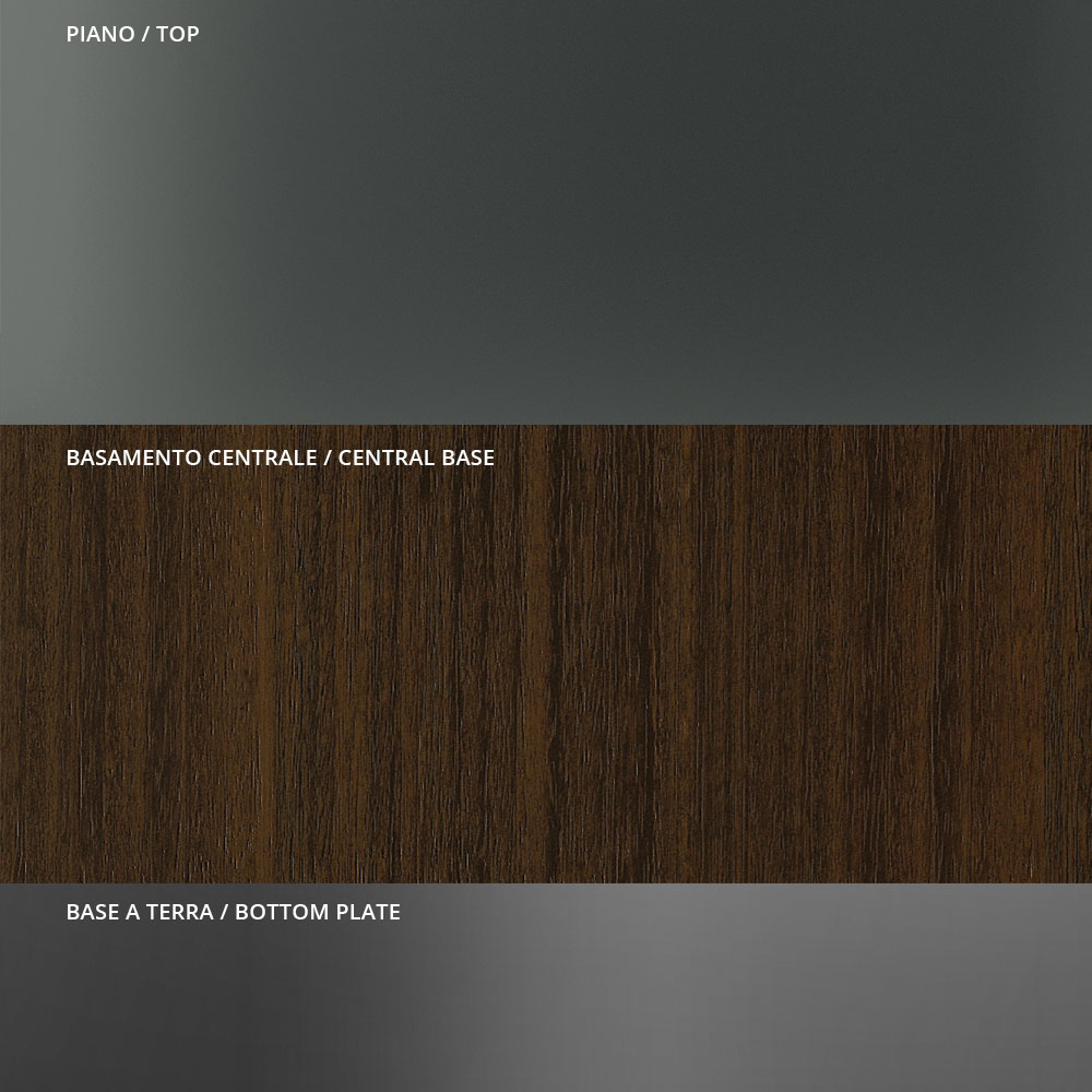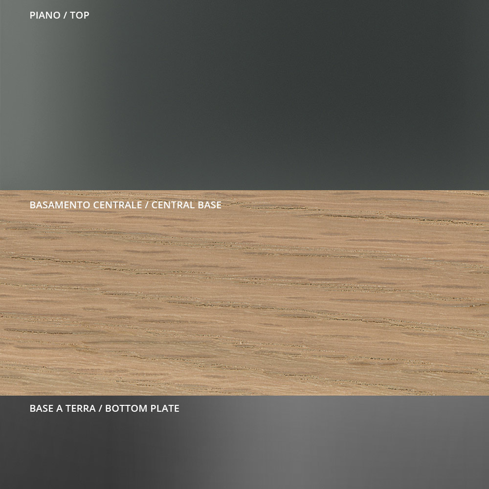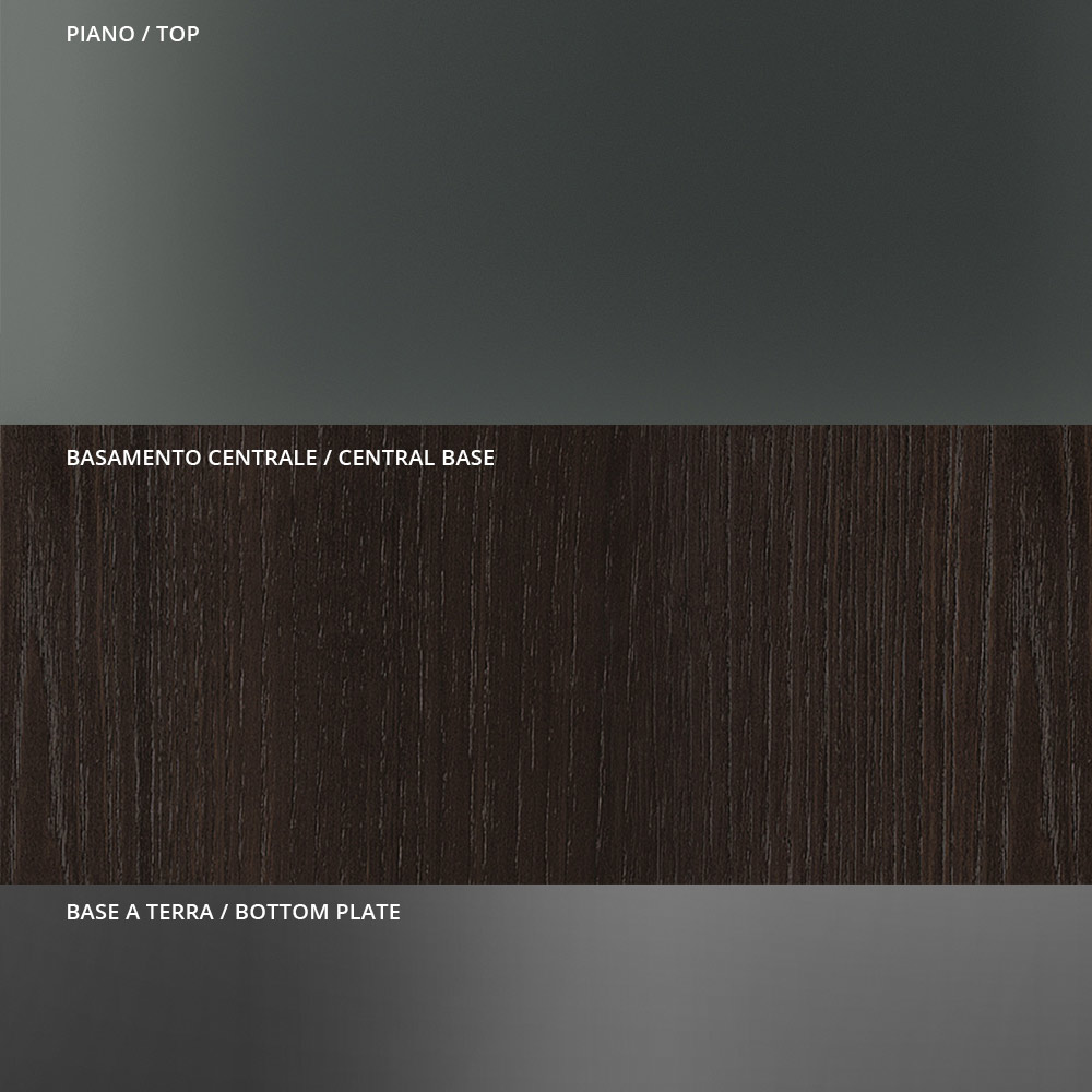 metal base with a shiny gunmetal gray finish. The top with its rounded edge gives softness to the shapes, while the metal elements complete the design of the table, enriching it with
