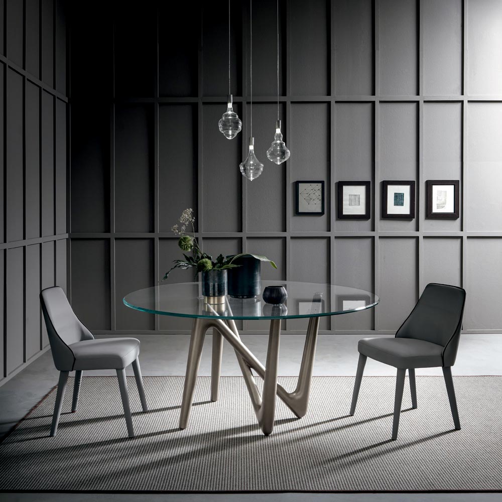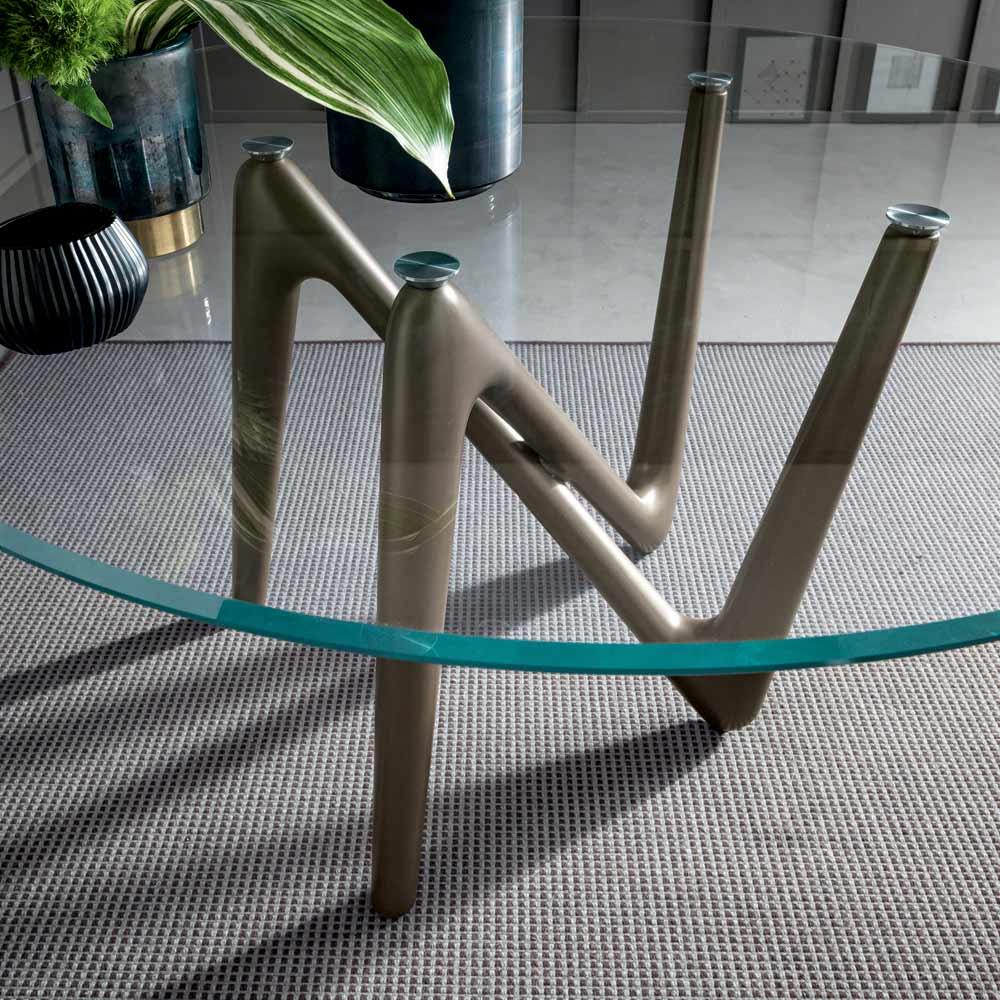 This round dining table has a structure with legs in metallic bronze painted rigid polyurethane and a barrel-shaped top in extra-clear transparent tempered glass with beveled edge.