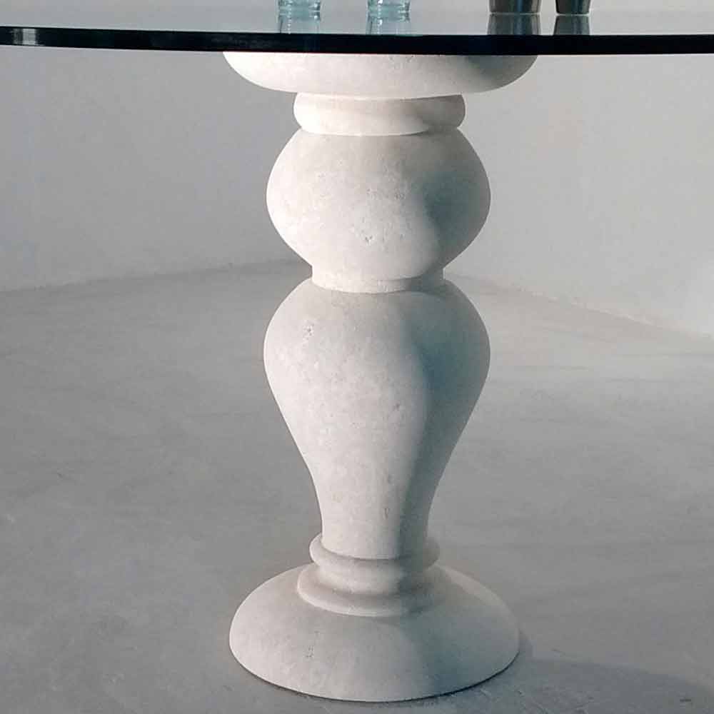 The dining table Edipo is entirely made in Italy. Its base is made of Vicenza natural stone and it has been hand-carved from the original stone block. The table top is made of float crystal (15 mm thickness) which has been secured to the base with an extractable steel flange.
