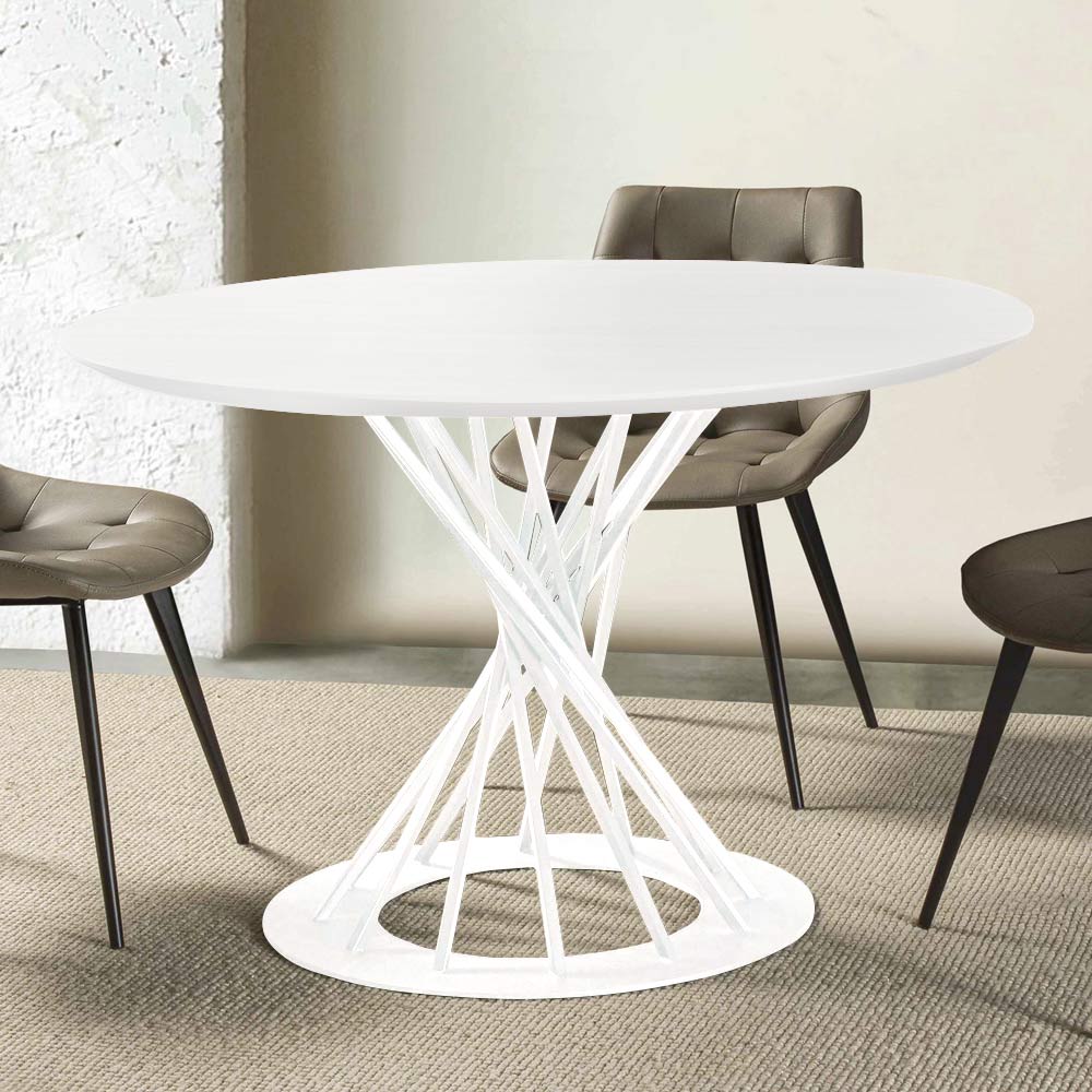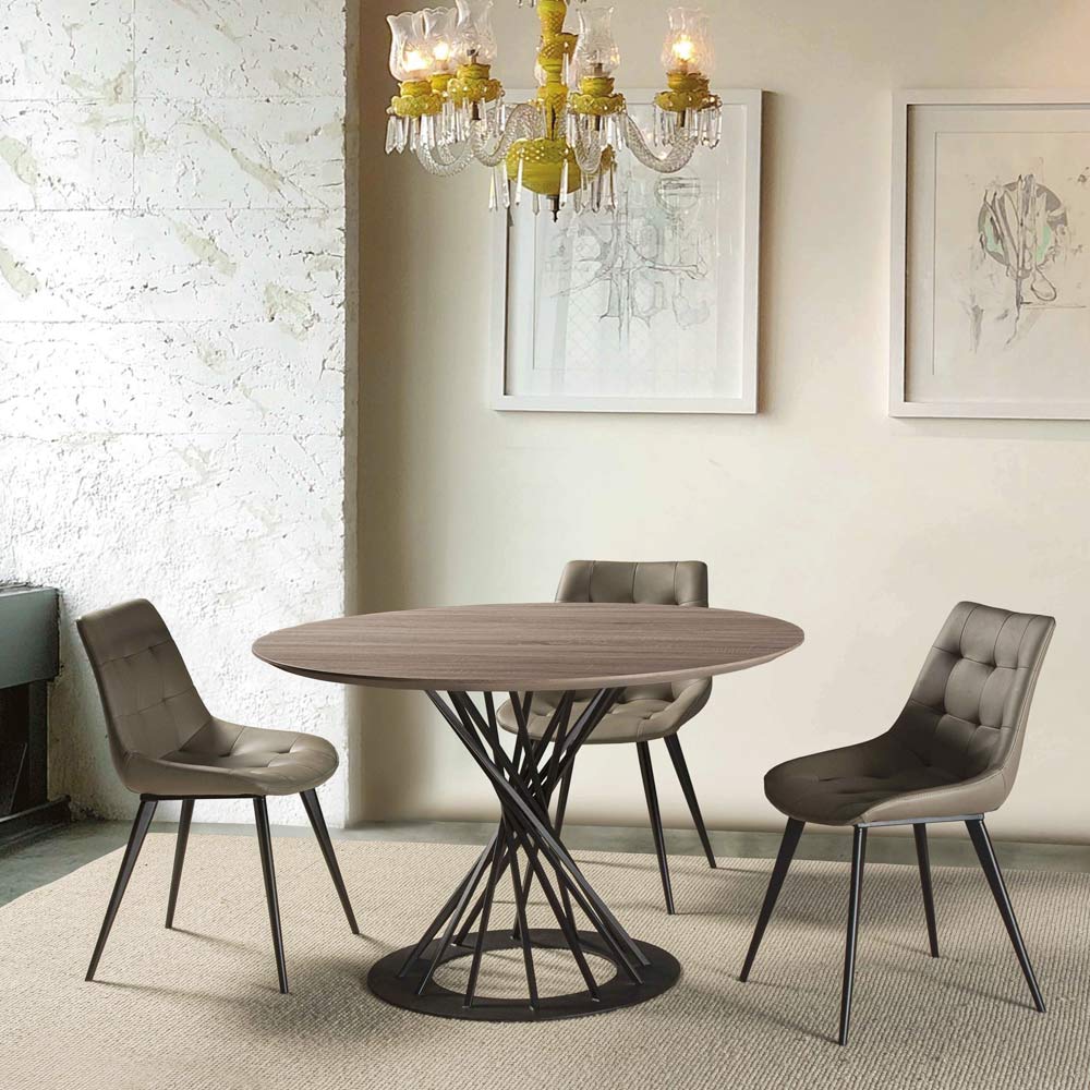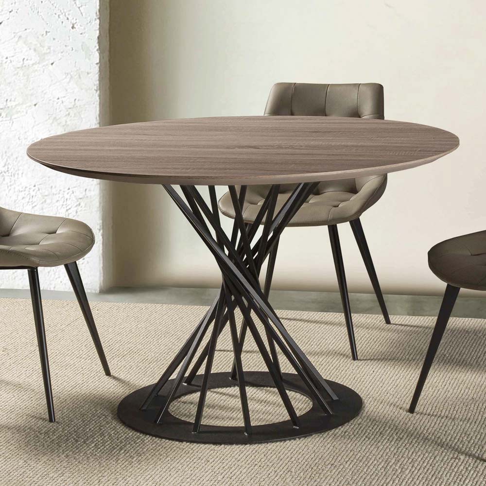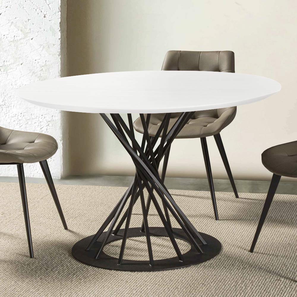 Round dining table with laminated wood top and steel base, diameter 120 cm.
