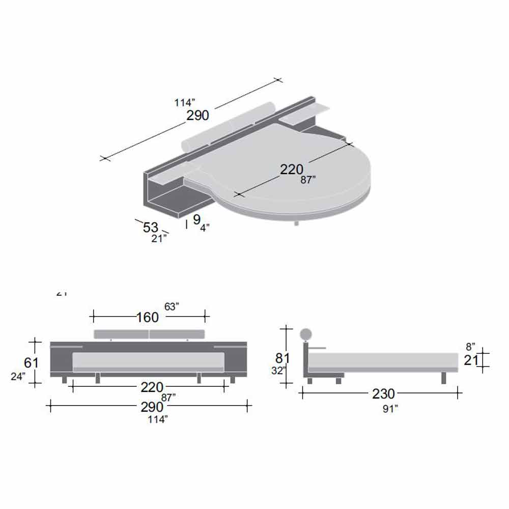 Round double bed with a unique and refined design characterized by the equipped headboard that makes the bed even more practical and functional, including a solid wood and plywood bench padded with polyurethane foam covered with polyester wadding and/or coupled velvet. Also on the headboard there are two glass shelves with LED light that act as practical bedside tables and a foam roller cushion positioned in the upper part and covered in fabric in the same color as the eco-leather upholstery of the bed.