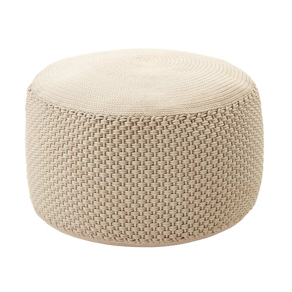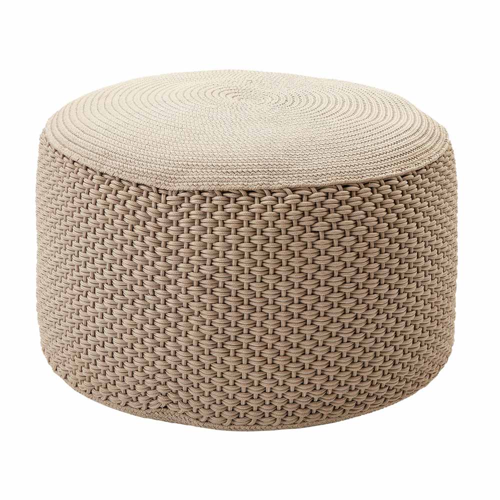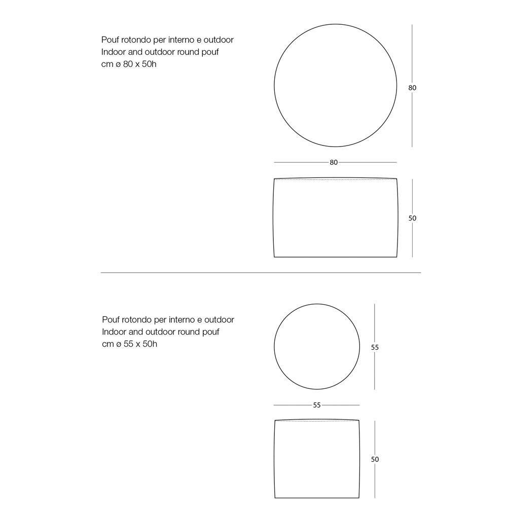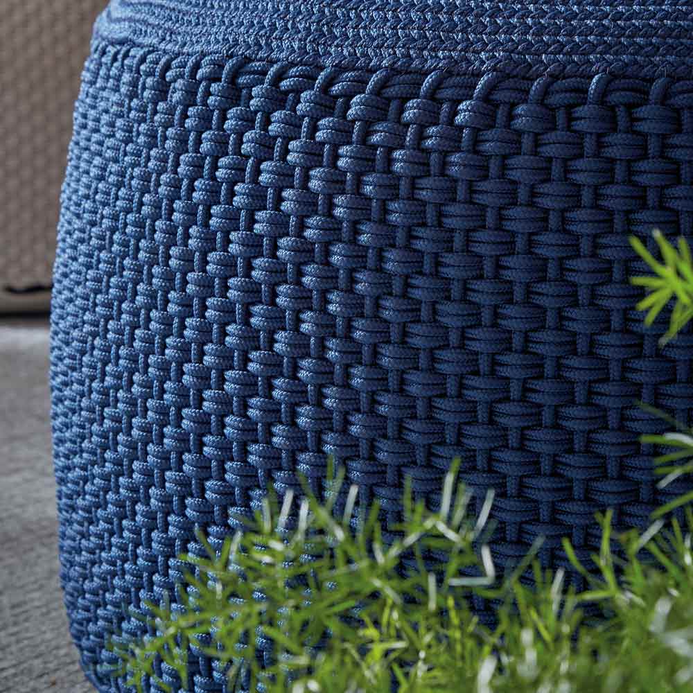 Round ottoman pouf for indoor or outdoor use in blue, dove gray or hemp polyester fiber, quality article made in Italy.
