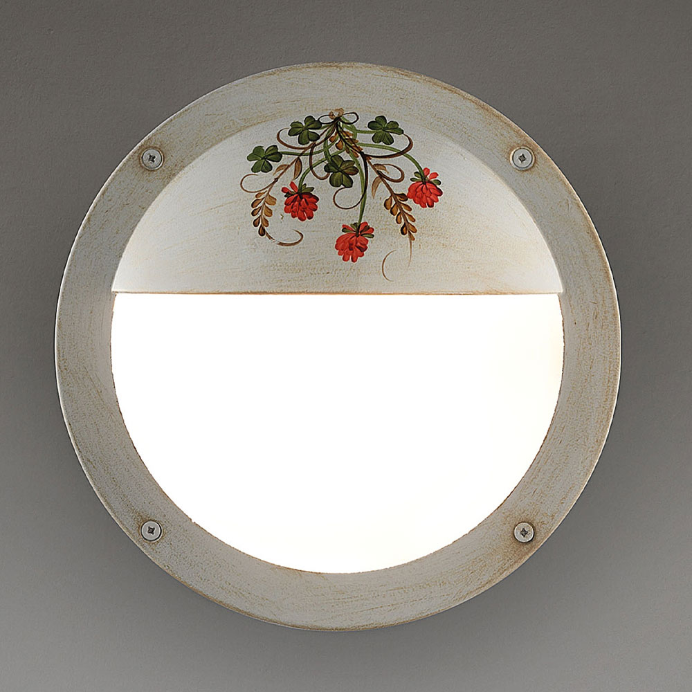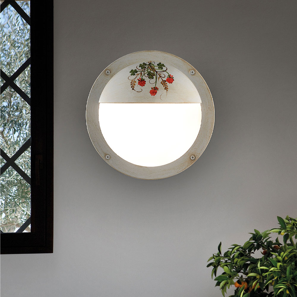 Round outdoor wall light in hand-painted aluminum with flowers, made in Italy by Ferroluce.