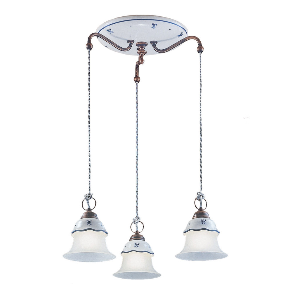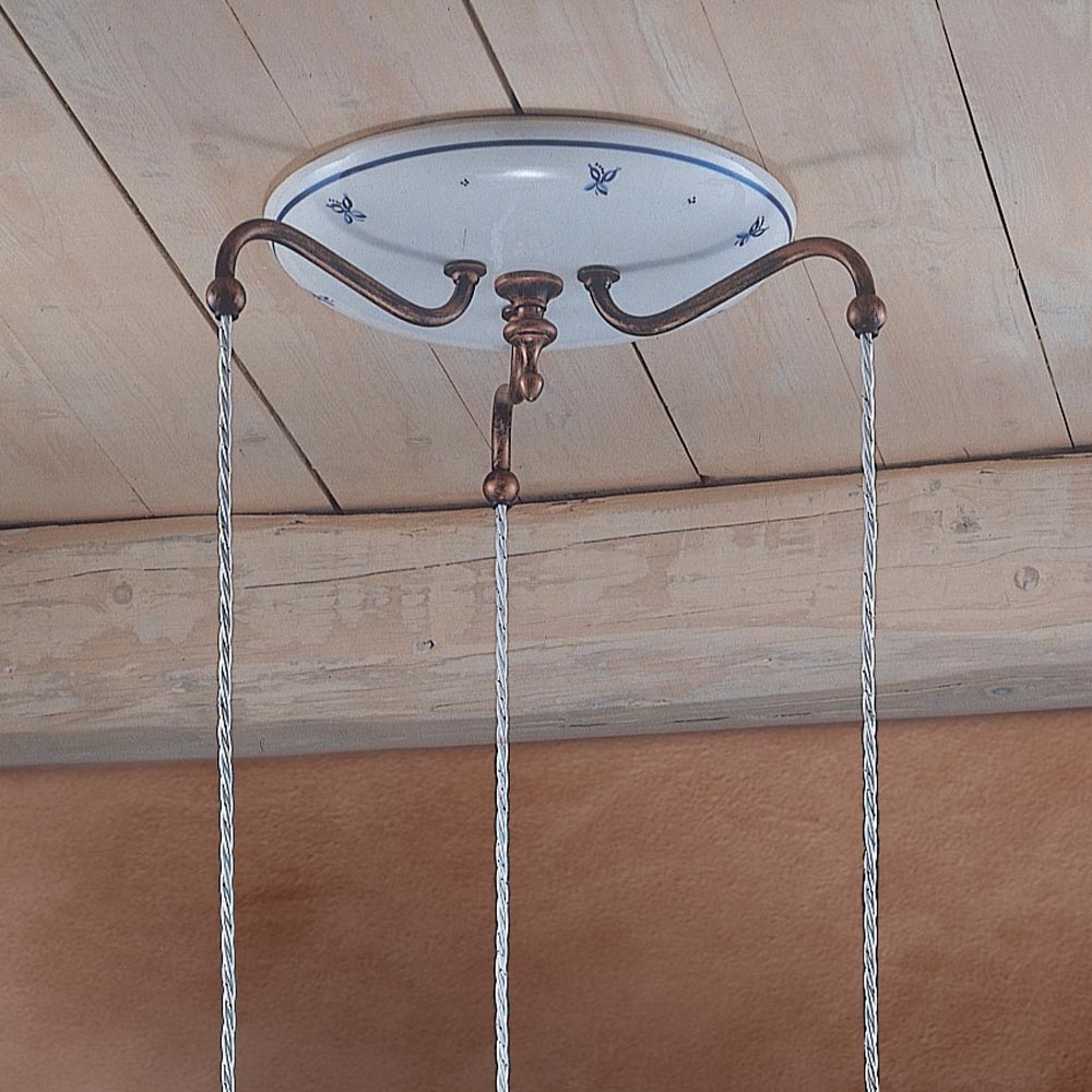 Suspended lamp with 3 lights in iron, hand-decorated ceramic and acid-etched glass made in Italy by Ferroluce.