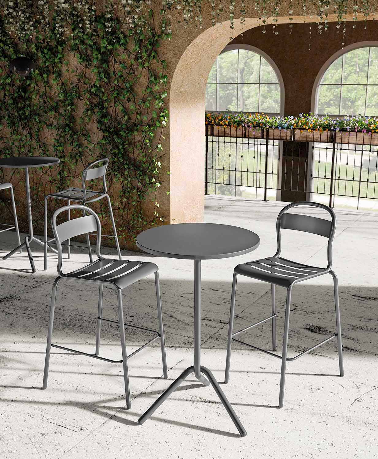 Outdoor round high table in metal and stackable and foldable sheet metal Made in Italy.