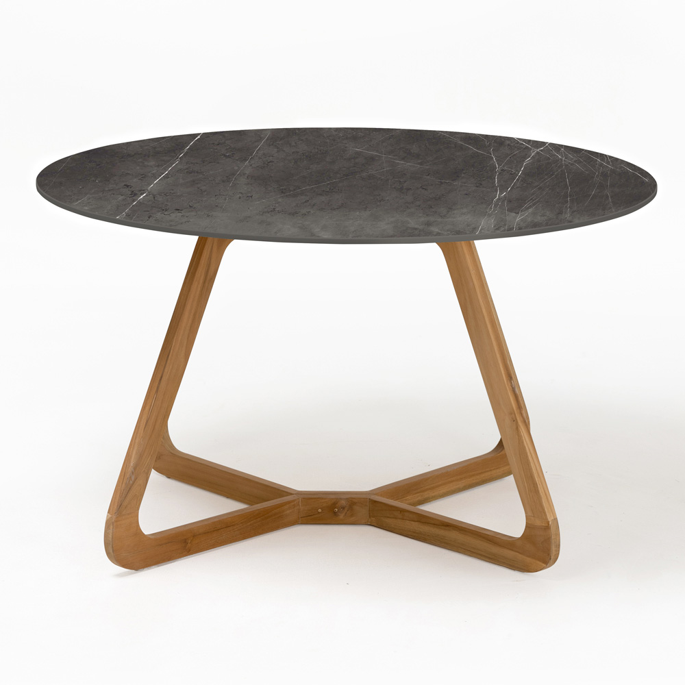 Outdoor table made with a solid natural teak wood base (35 mm thick), infinity stoneware ceramic top (12 mm thick) with a matt Pietra Grey finish and a subframe in Okumé marine plywood , entirely Made in Italy.