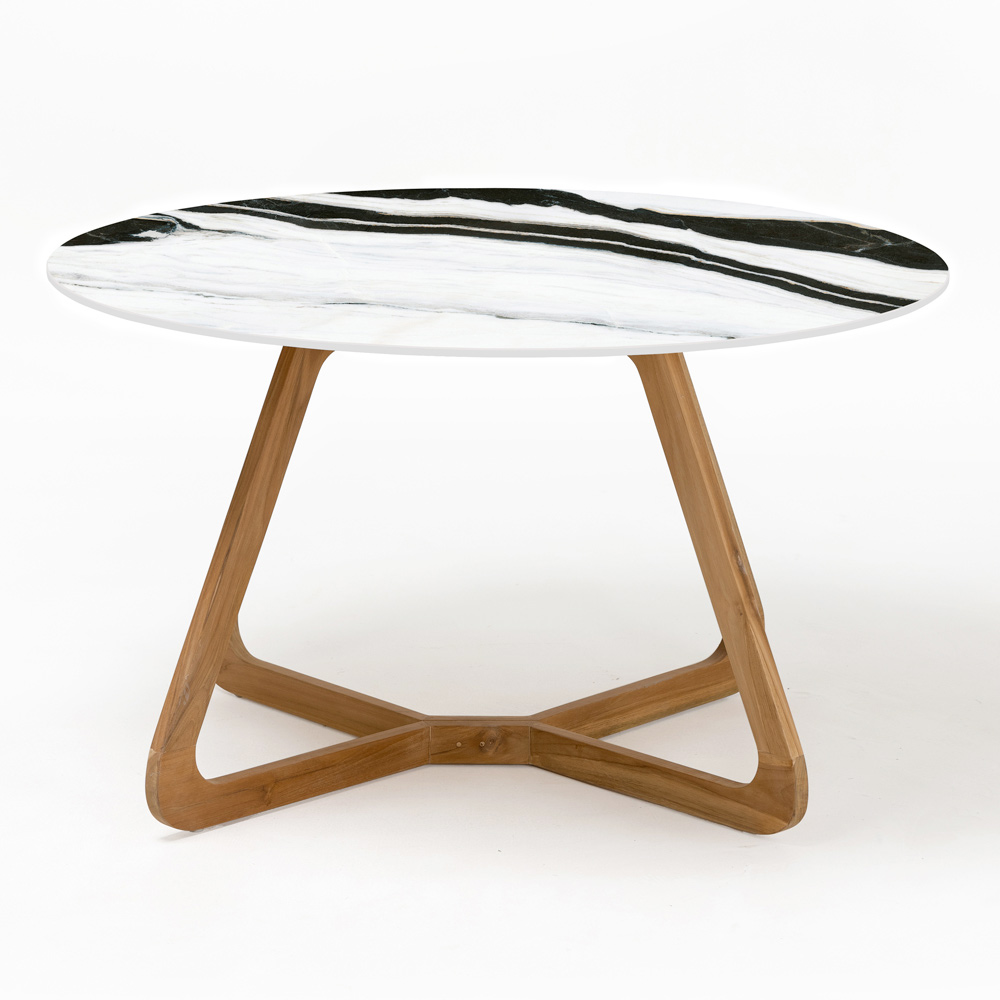 Outdoor table made with a solid natural teak wood base (35 mm thick), infinity stoneware ceramic top (12 mm thick) with a glossy Panda White finish and a subframe in Okumé marine plywood , entirely Made in Italy.