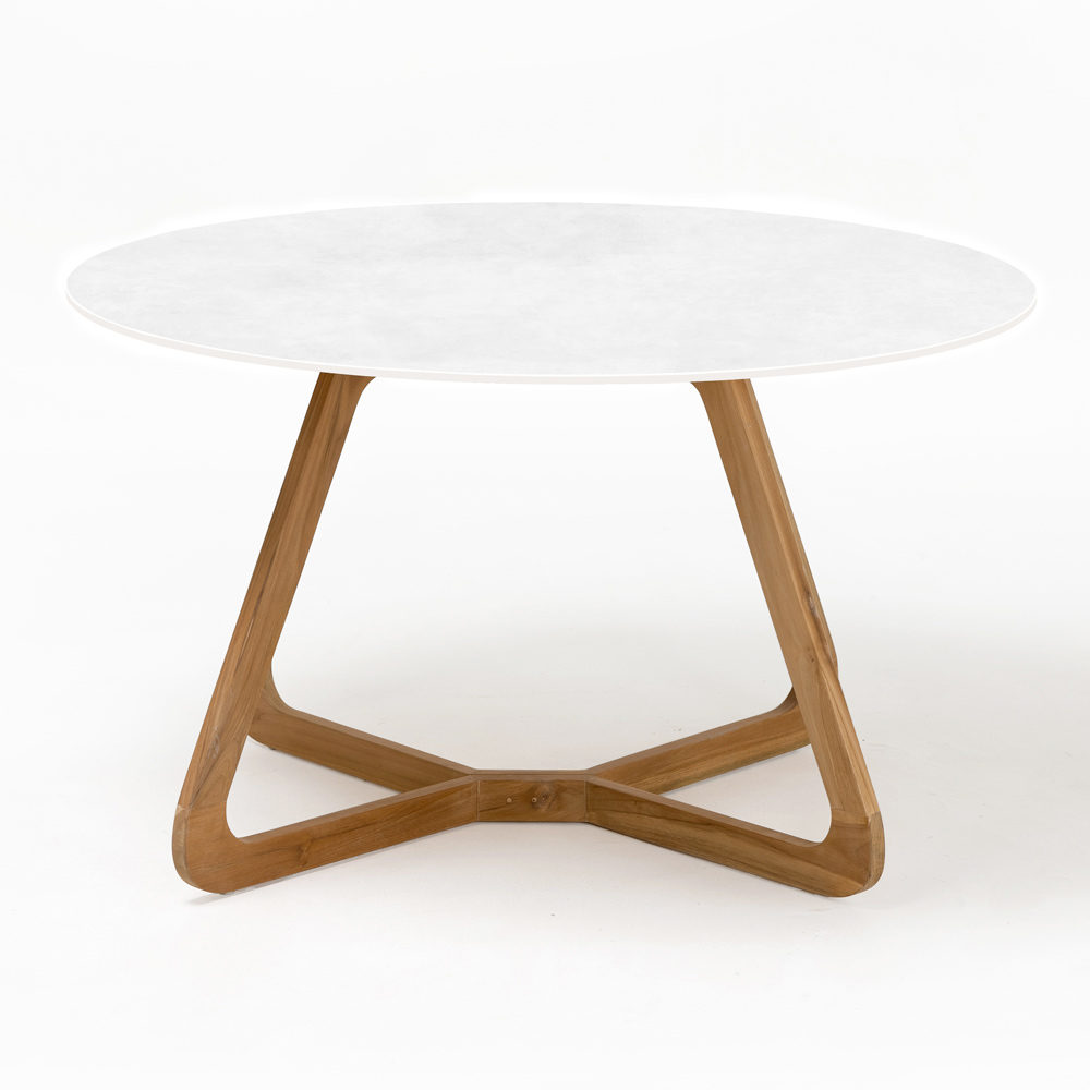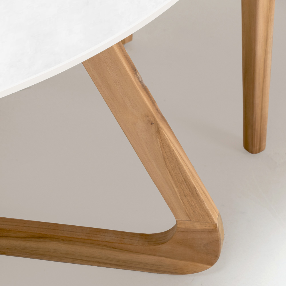 The wooden base adds a contrast of warmth and texture, balancing the freshness of the ceramic top with its richness and strength. This combination of materials is not only aesthetically appealing but also offers exceptional durability and resistance to the elements, making the table ideal for daily outdoor use.