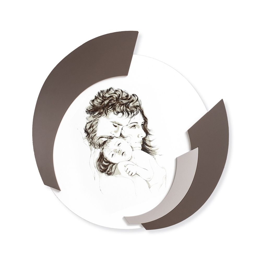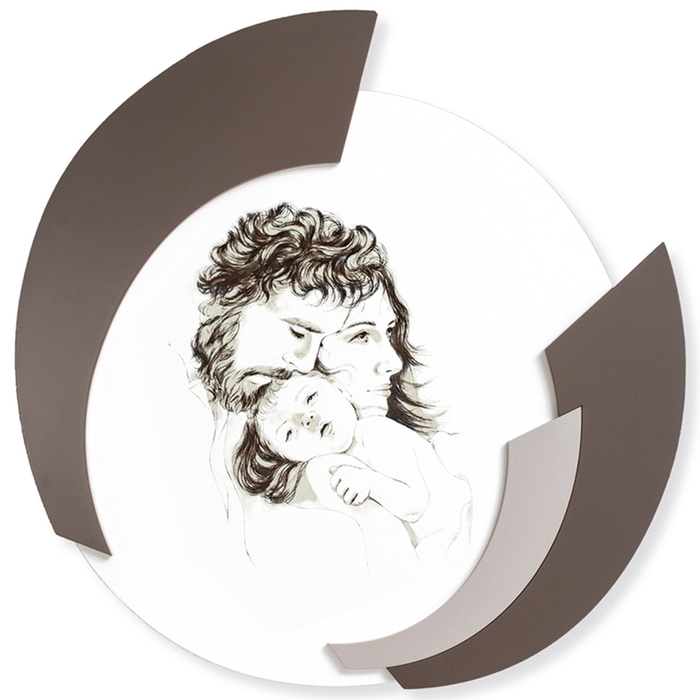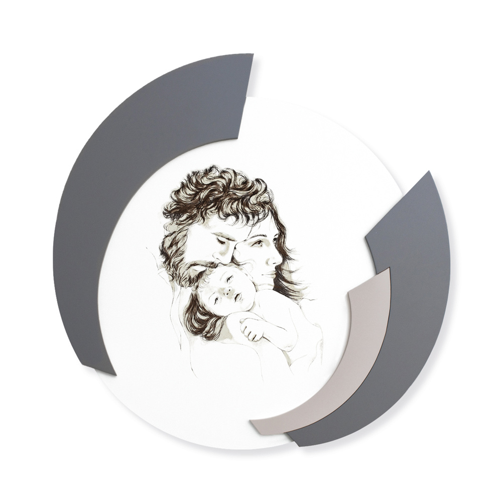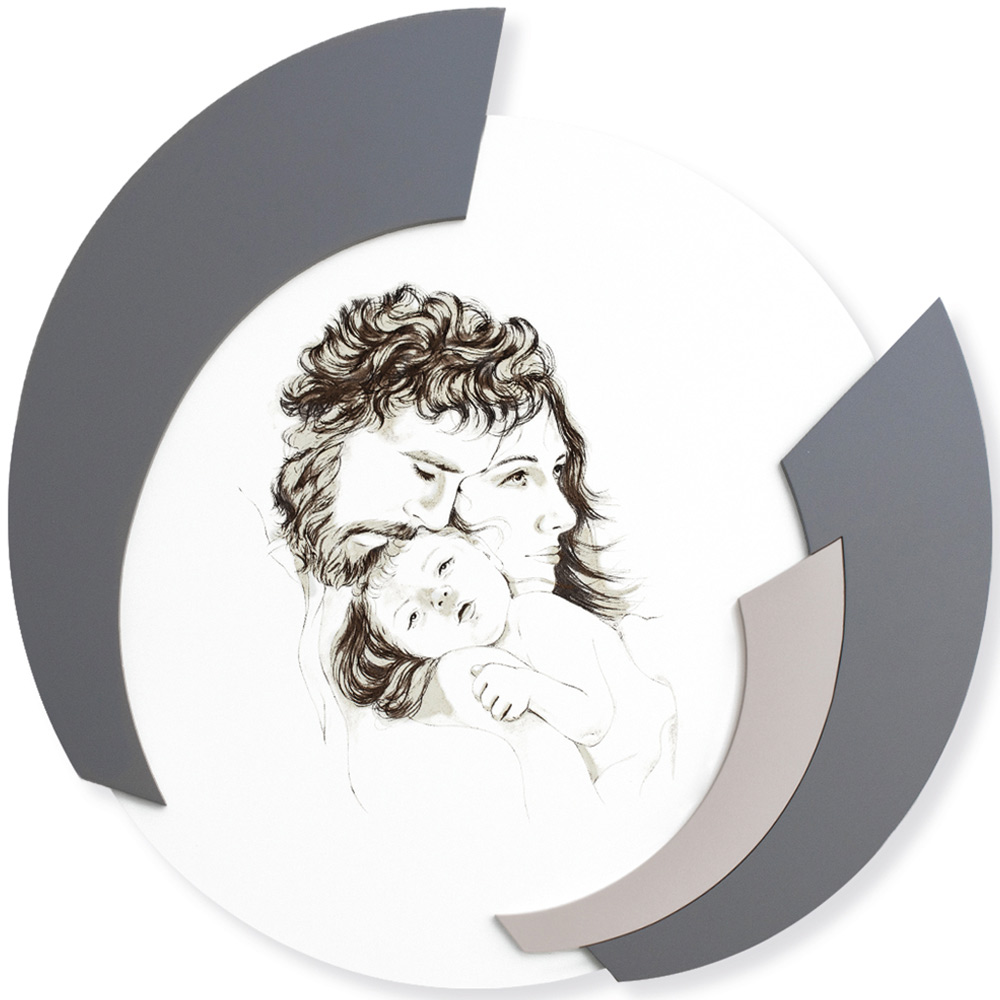 A round headboard that encloses the image of the Holy Family surrounded by wooden decorations lacquered in the colors of your choice . Matt white lacquered wooden panel with laser marking, a special technique that creates a bas-relief on the materials. The original handmade design combined with laser technology gives life to this work engraved on several levels.