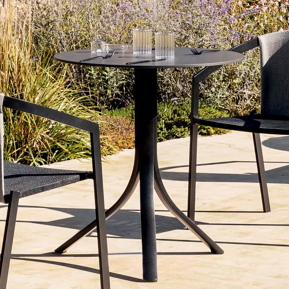 Round outdoor bar table with a reclining design in aluminum and hpl in 2 finishes, made in Italy.
