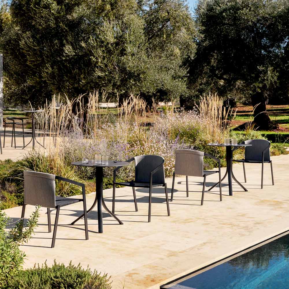 The collection is characterized by the detail of the aluminum leg as a focal point combined with formal rigor, to experience the outdoors in terms of maximum relaxation and conviviality, seated on the sofa, around a table or lying on the sunbed.