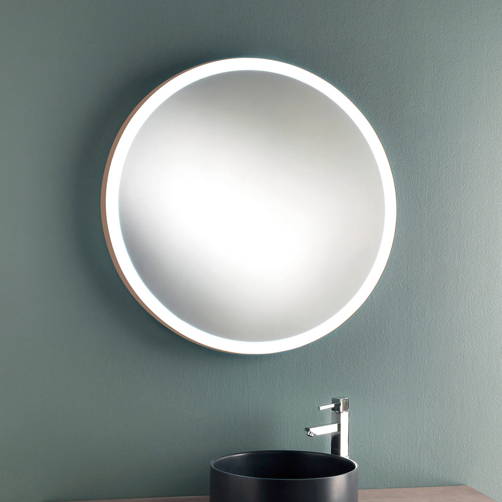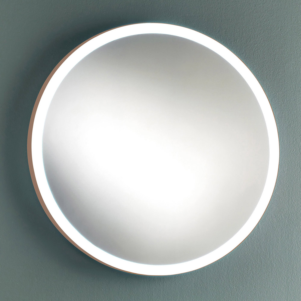 Round wall mirror with copper metal frame and led lighting, made in Italy.
