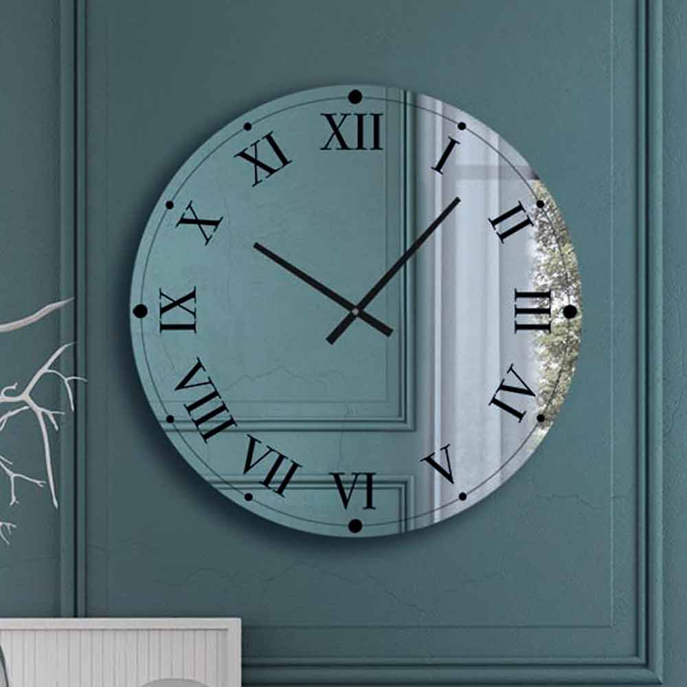 mirrored crystal glass with Roman numerals and black hands.