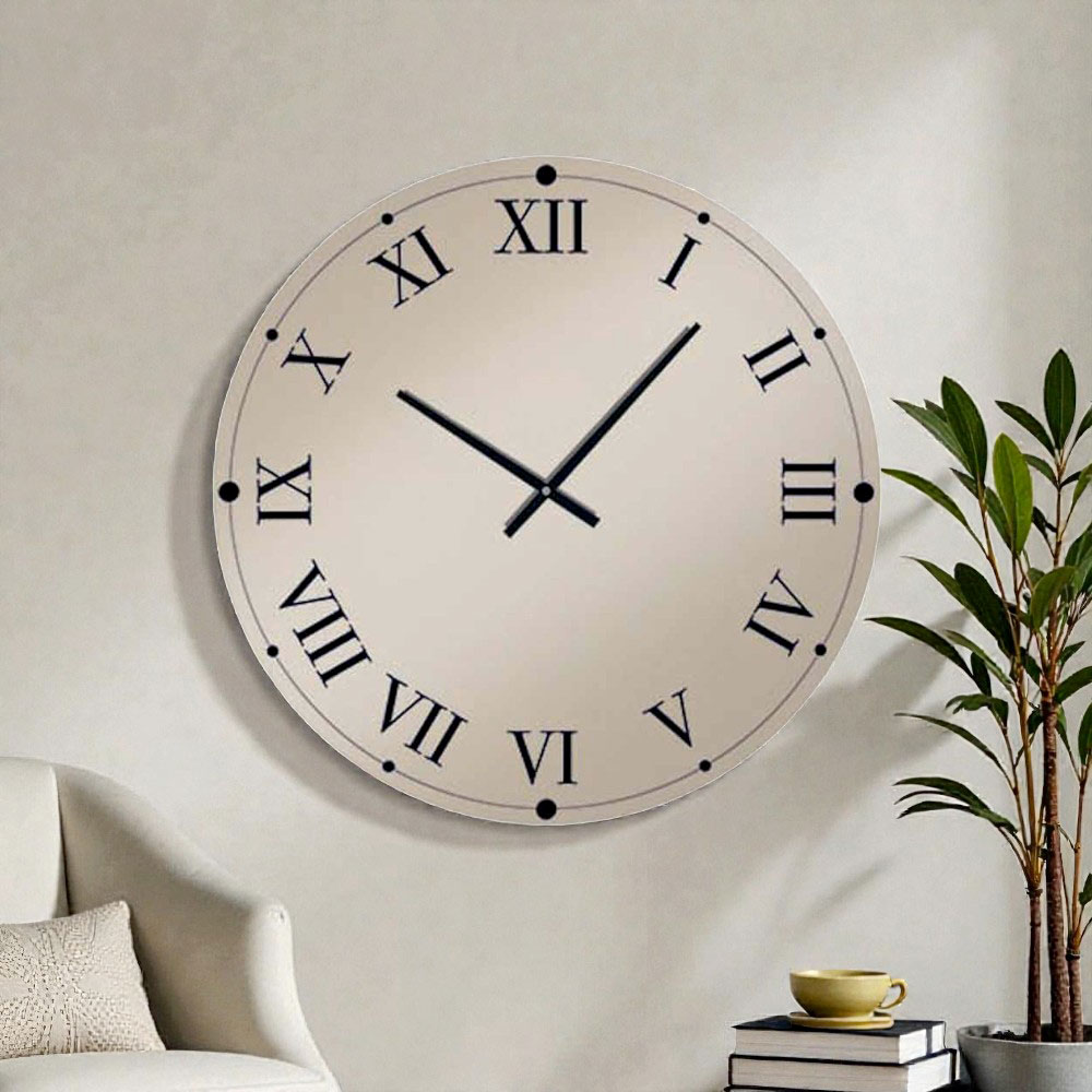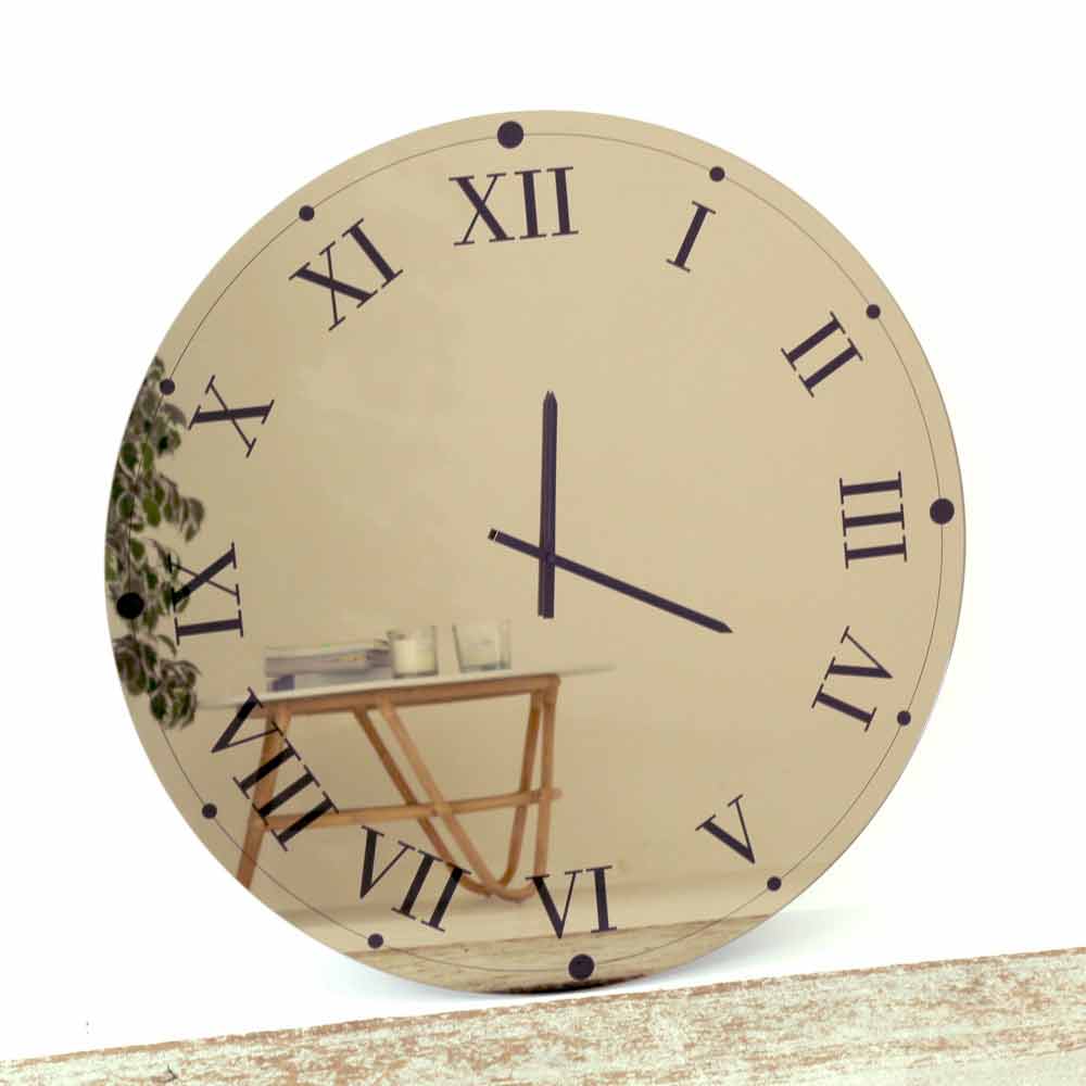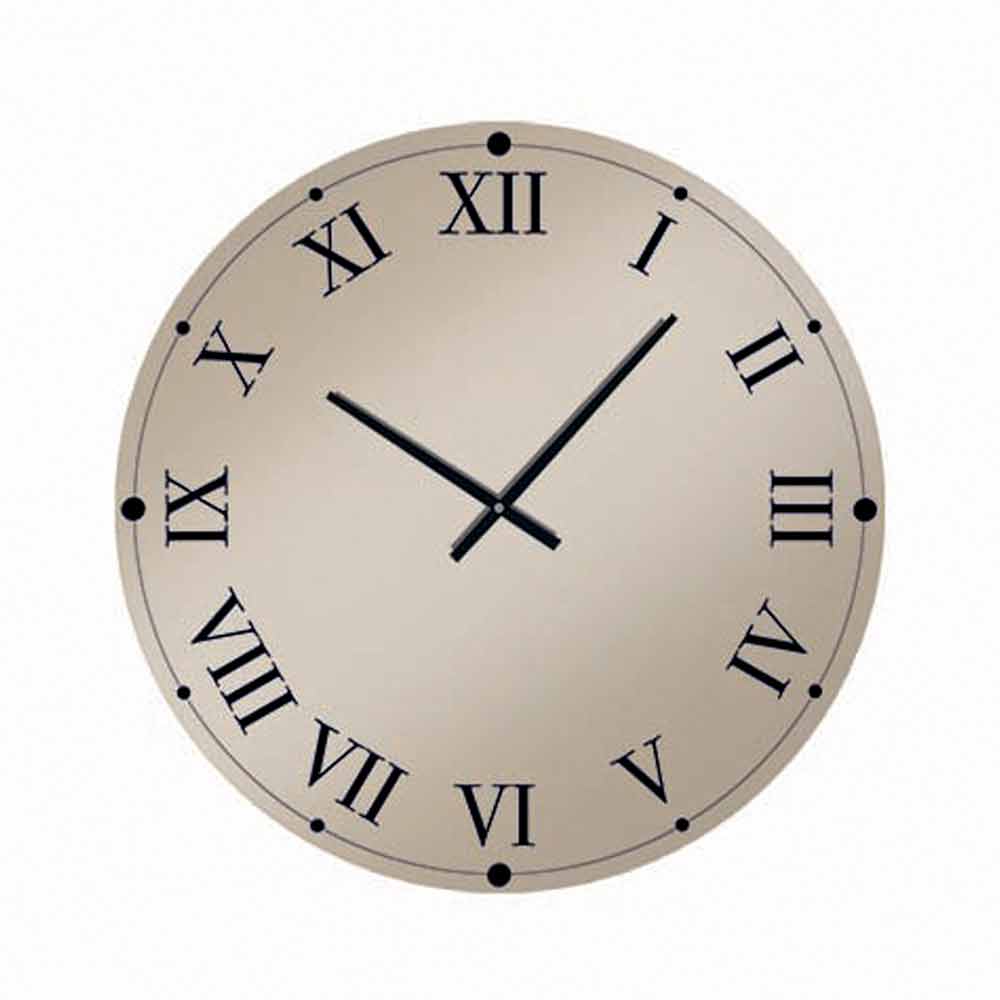 Round wall clock Made in Italy made of mirrored crystal glass with Roman numerals and black hands.