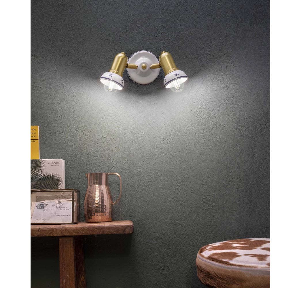 This round design 2-spotlight wall light is entirely made in brass and ceramic with hand-painted decoration, to highlight the skill and manual skills of the artisans.
