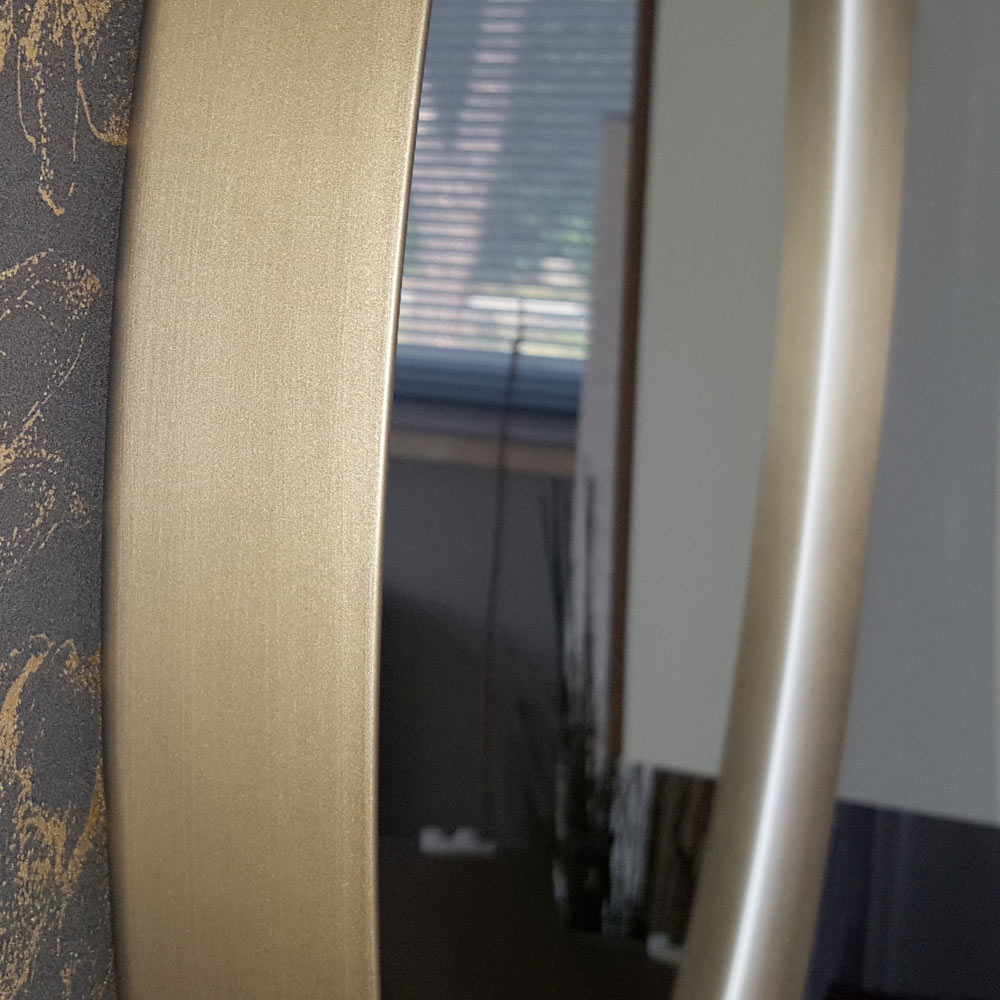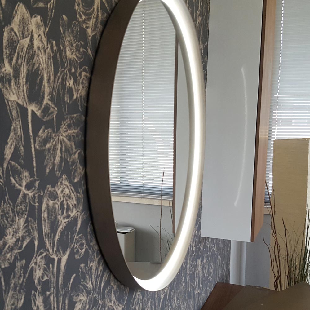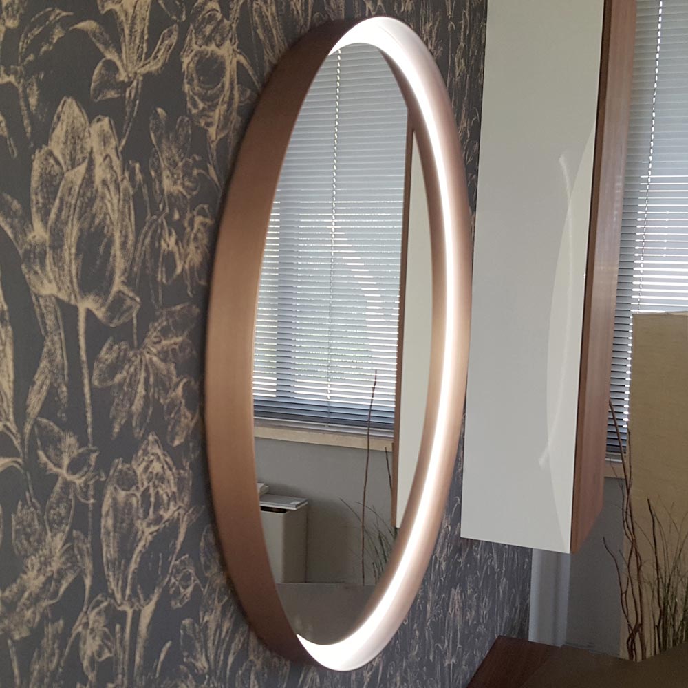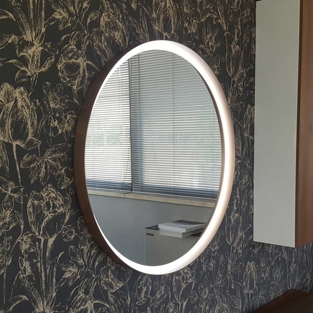 Round wall mirror with metal frame in 4 finishes and led light, made in Italy.