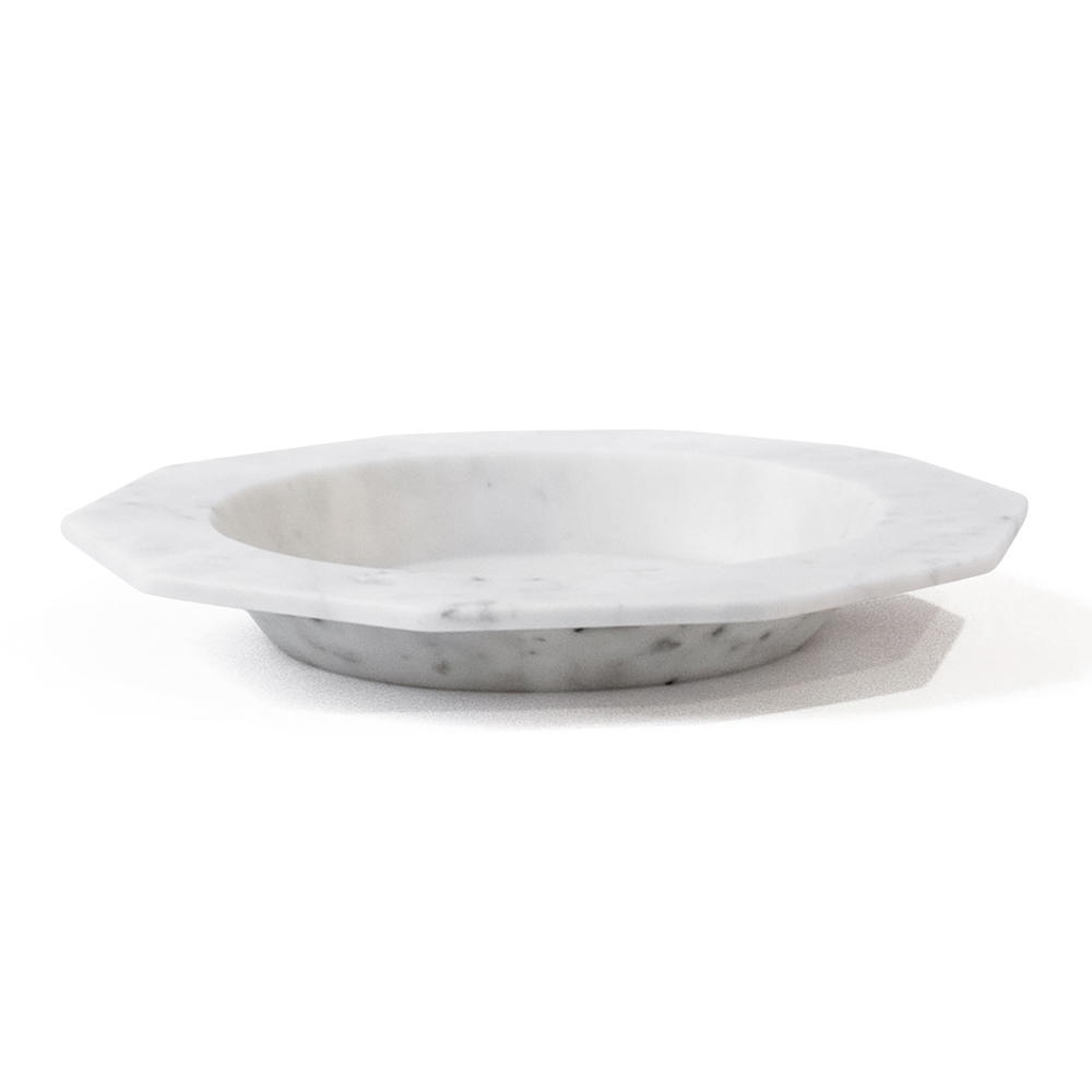 This marble plate is an enchanting union of functionality and art . The elegant white marble with light gray veins is worked into an organic, wavy shape, reminiscent of the petals of a newly bloomed flower, thus inviting nature to the table.