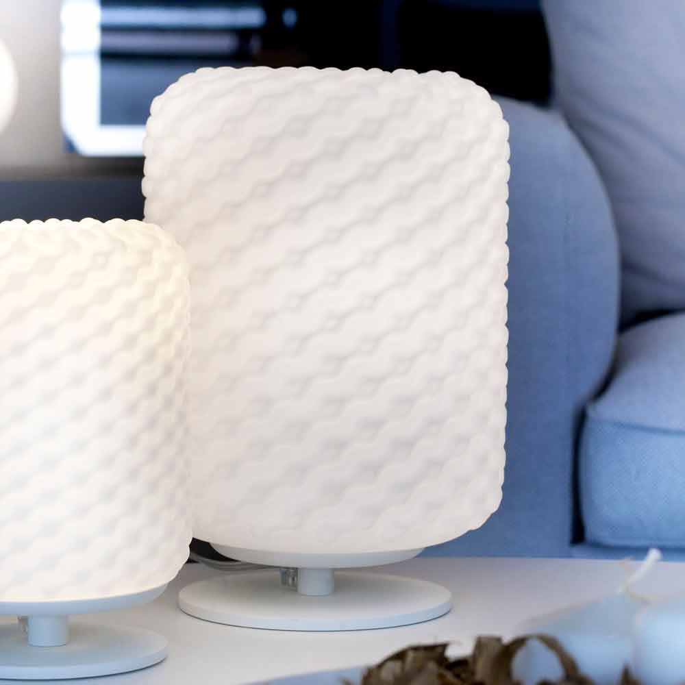 Rich collection of blown glass lamps with a specialised honeycomb relief manufacture that adorns the glass itself. The glass shade can be cylindrical in two sizes and also in a spherical one. Moreover, it is available in three satin colours: white, amber and smoked.