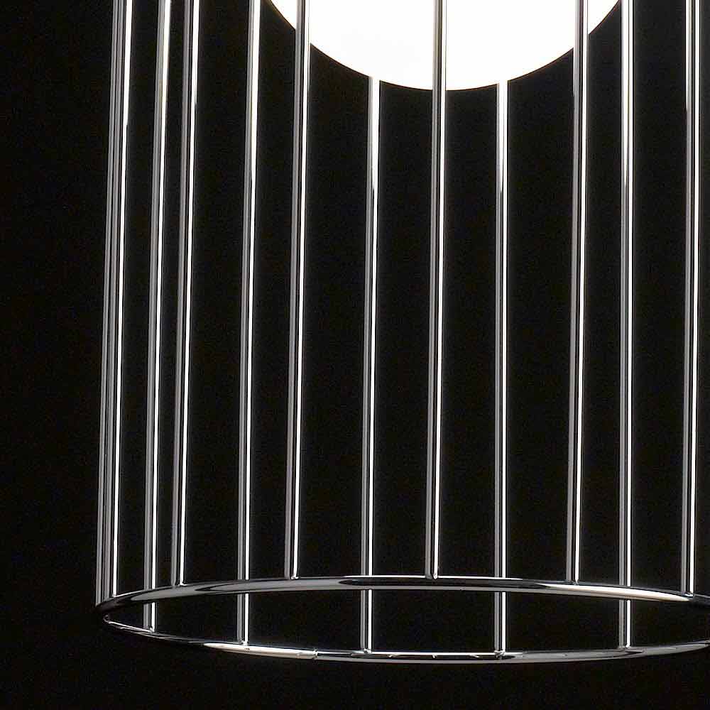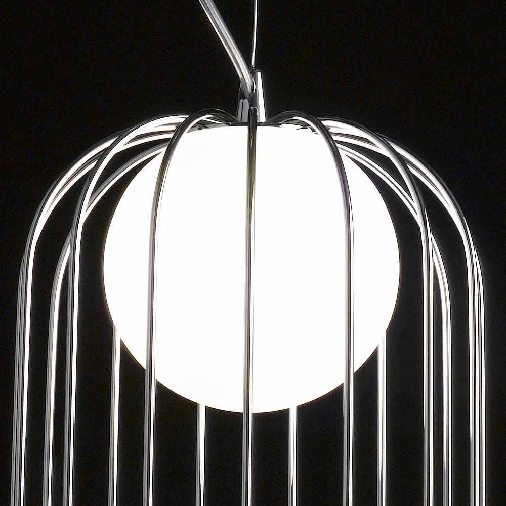 Collection of three suspensions and three table lamps, which can reach a considerable size, composed by a metal cage and a milky white blown glass ball.