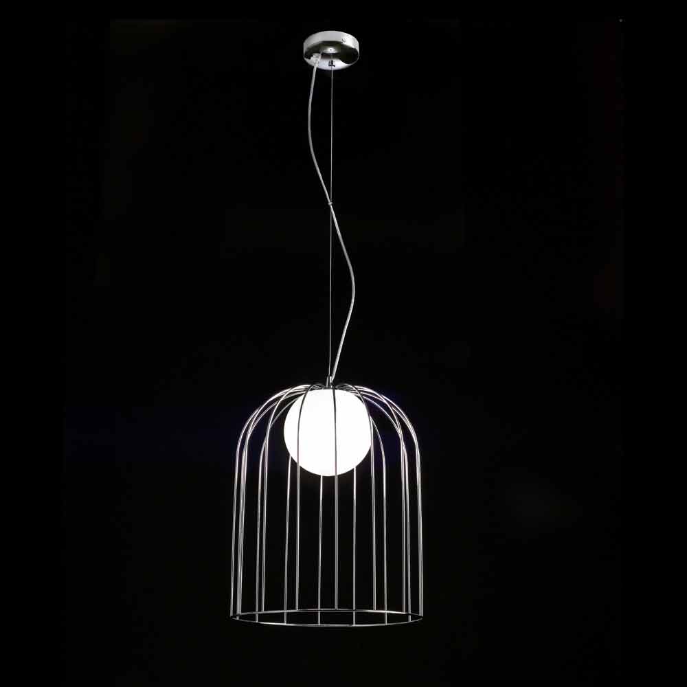 Collection of three suspensions and three table lamps, which can reach a considerable size, composed by a metal cage and a milky white blown glass ball.