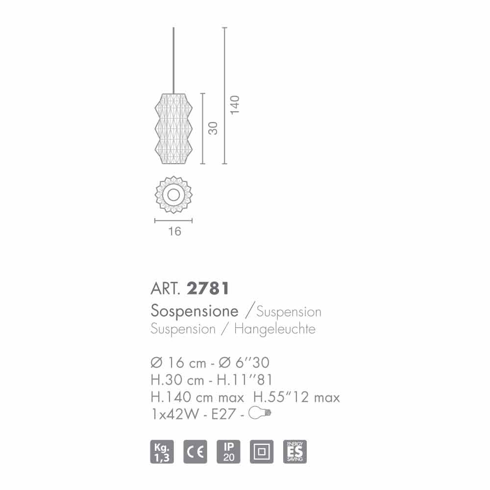 Selene Origami blown glass pendant lamp, Ø16 H 30/140cm, modern design.