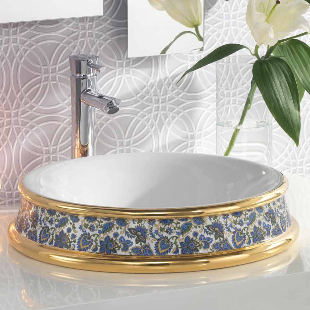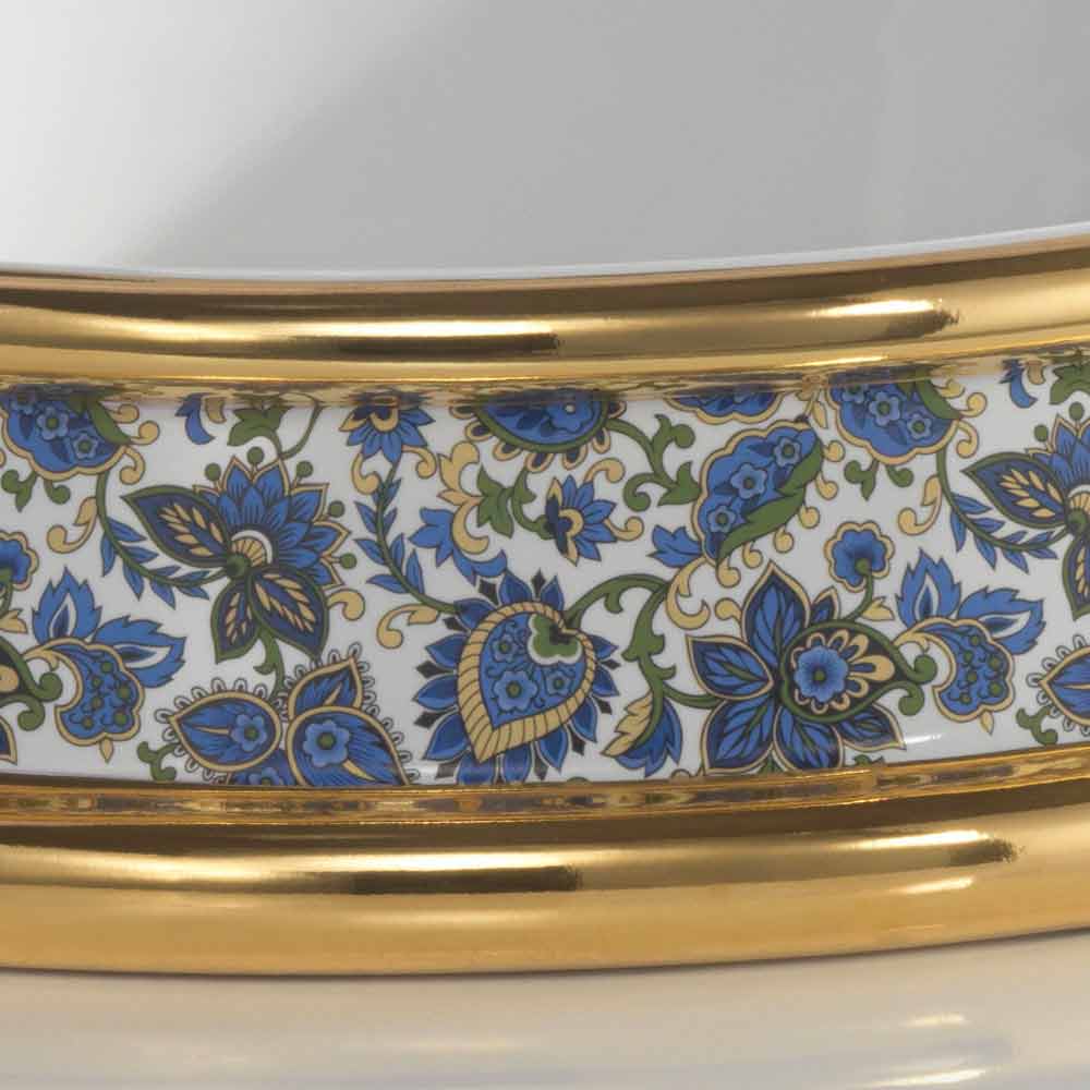 Semi-recessed bathroom sink made in Italy in handmade fire clay with blue and gold floral decoration band and 24 carat gold painted rings.