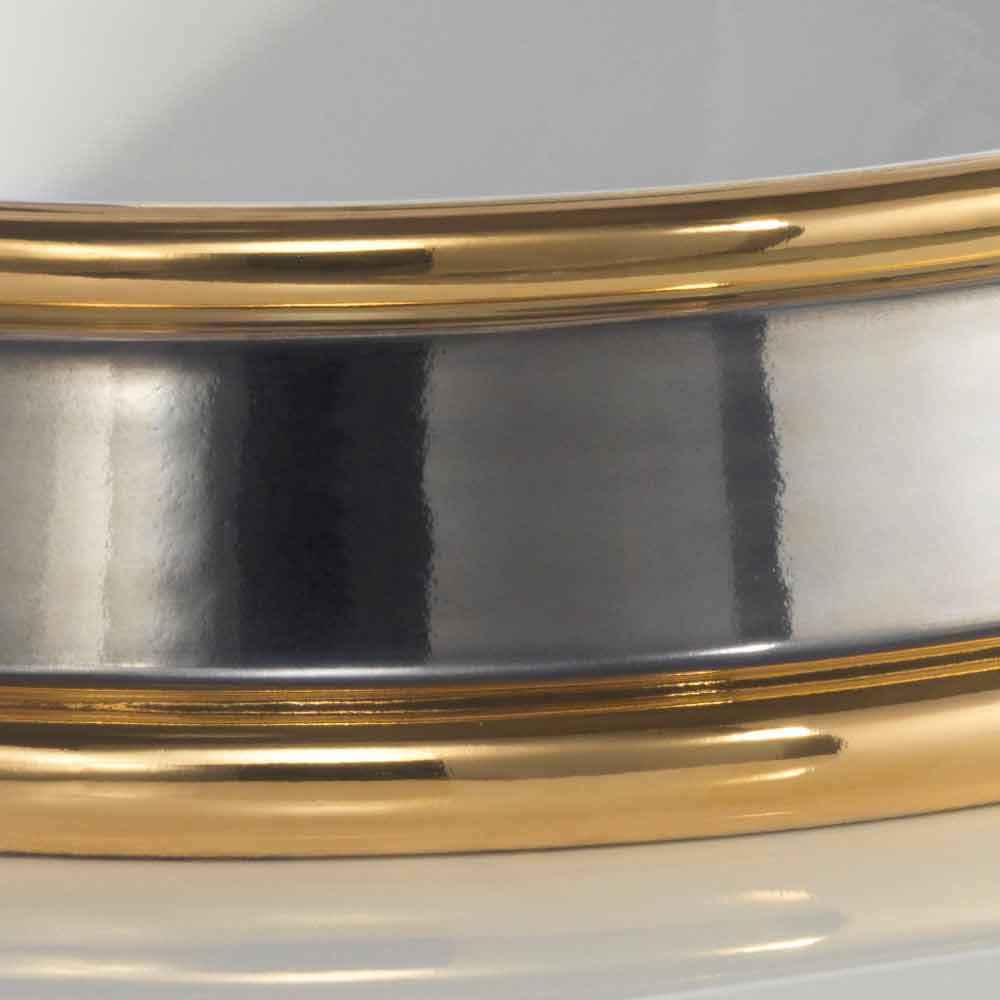 Semi-recessed bathroom sink made in Italy in hand-crafted fire clay with hand-painted platinum band and hand-painted rings with 24-carat gold finish.
