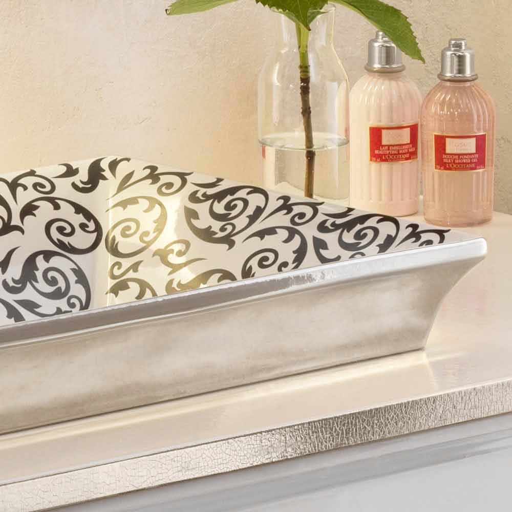 Semi-recessed bathroom sink made in Italy in fire clay with handmade ornamental floral decorations inside and finished in platinum on the outside.