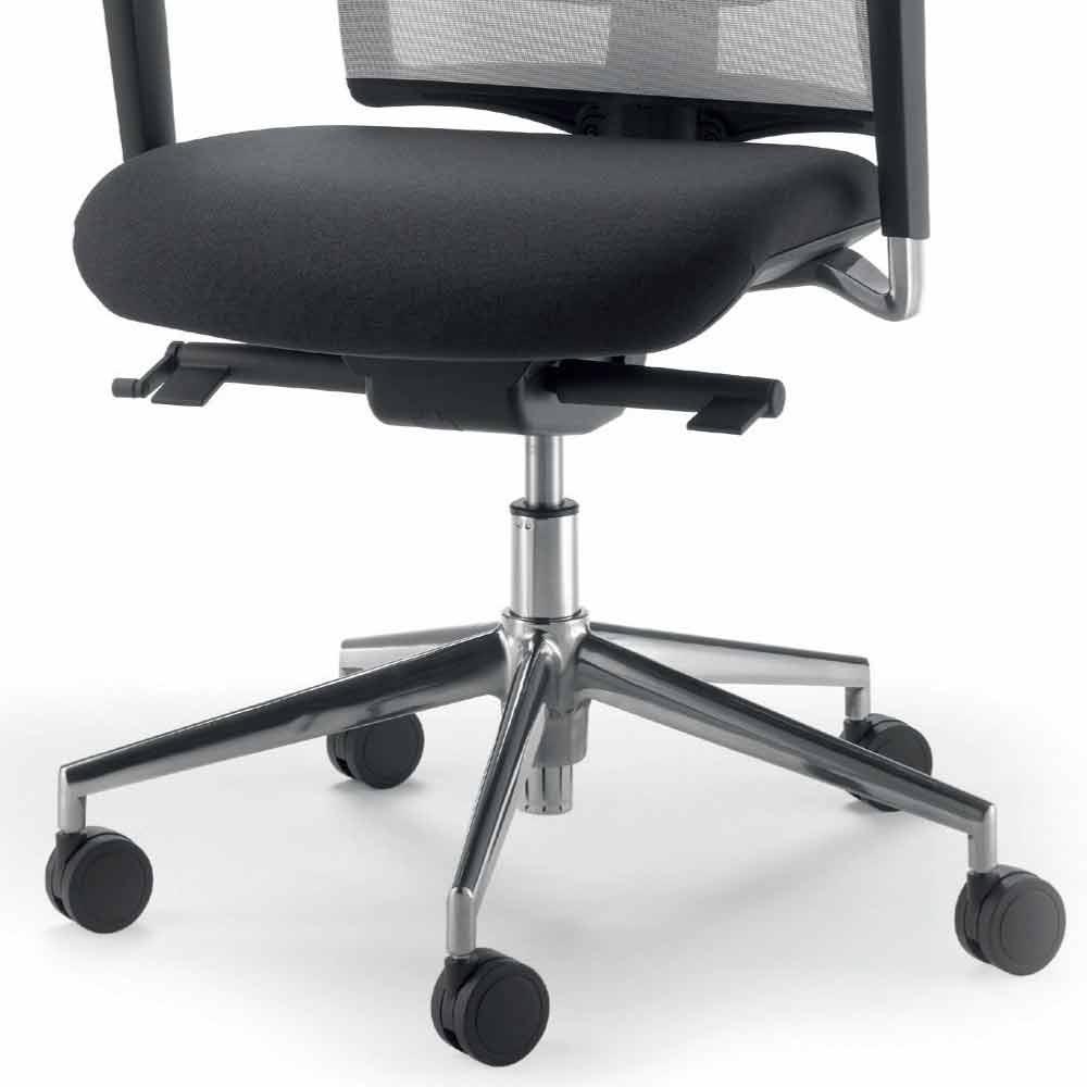 Another peculiarity of Mina are its height-adjustable armrests with push-button operation, with 70 mm stroke, forward/reverse translation and width (3D), made of polished die-cast aluminum, complete with tops and plastic parts in 15% PA6 nylon with glass fiber in black finish, complete with black soft PU top.