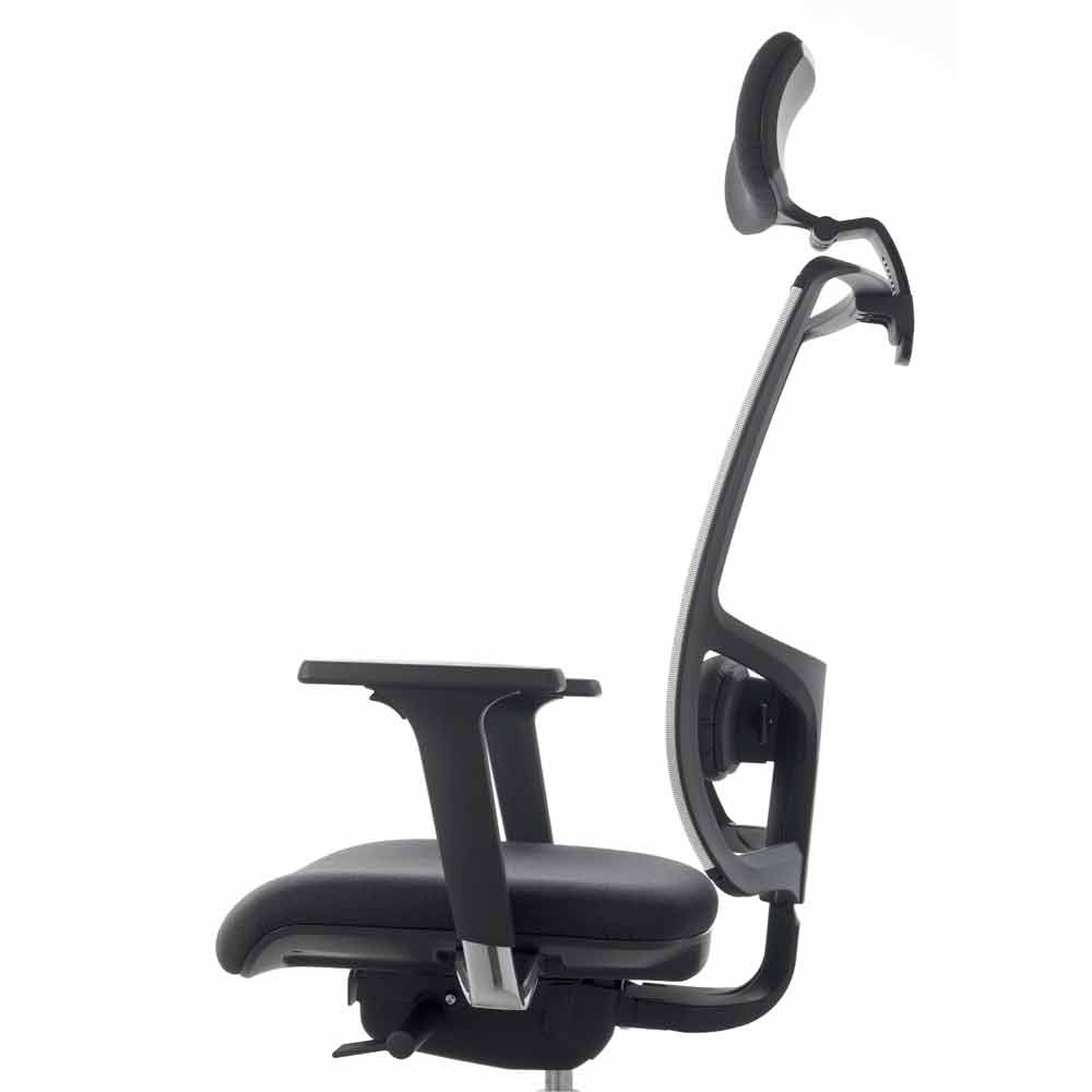 Mina is also equipped with a load-bearing headrest made of 15% PA6 nylon with glass fiber, black color, adjustable in height and depth to find the best position, complete with a polyurethane foam padding, molded, fireproof and coated.