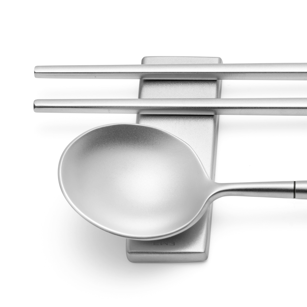 The long, slender chopsticks are designed for comfortable use and a secure grip, while the spoon has an optimal depth for sipping broths and sauces with ease. The distinctive element is the square base which serves as a rest for cutlery, ensuring that it always remains clean and well presented when not in use.