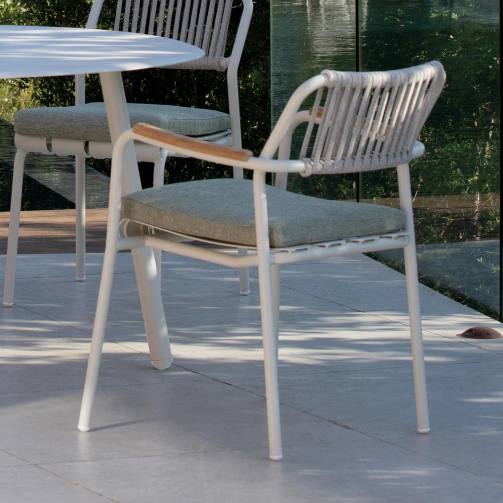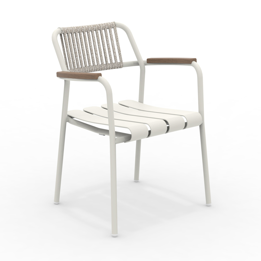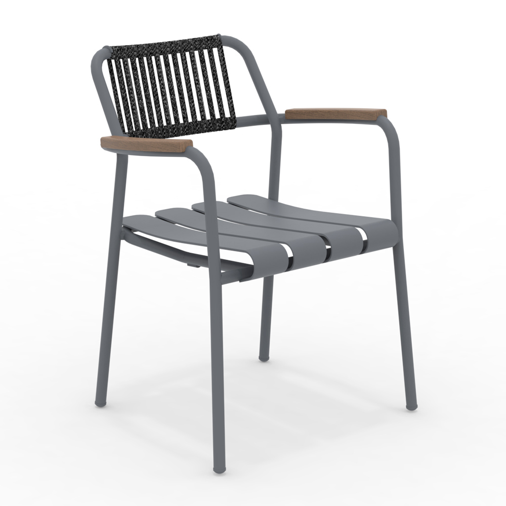 2 outdoor armchairs made with an aluminum frame, FSC teak armrests and rope backrest.