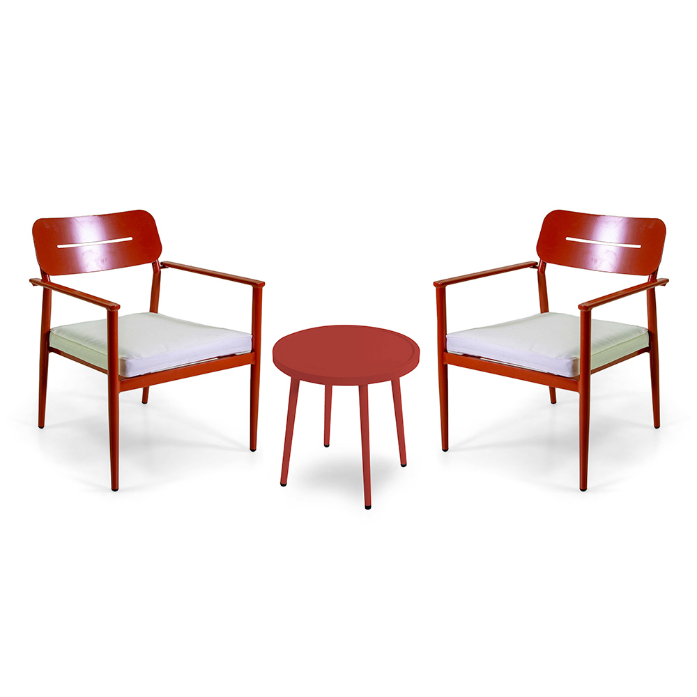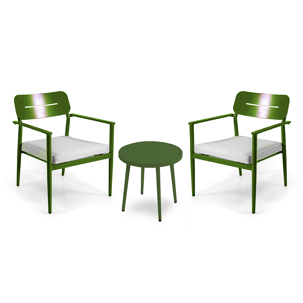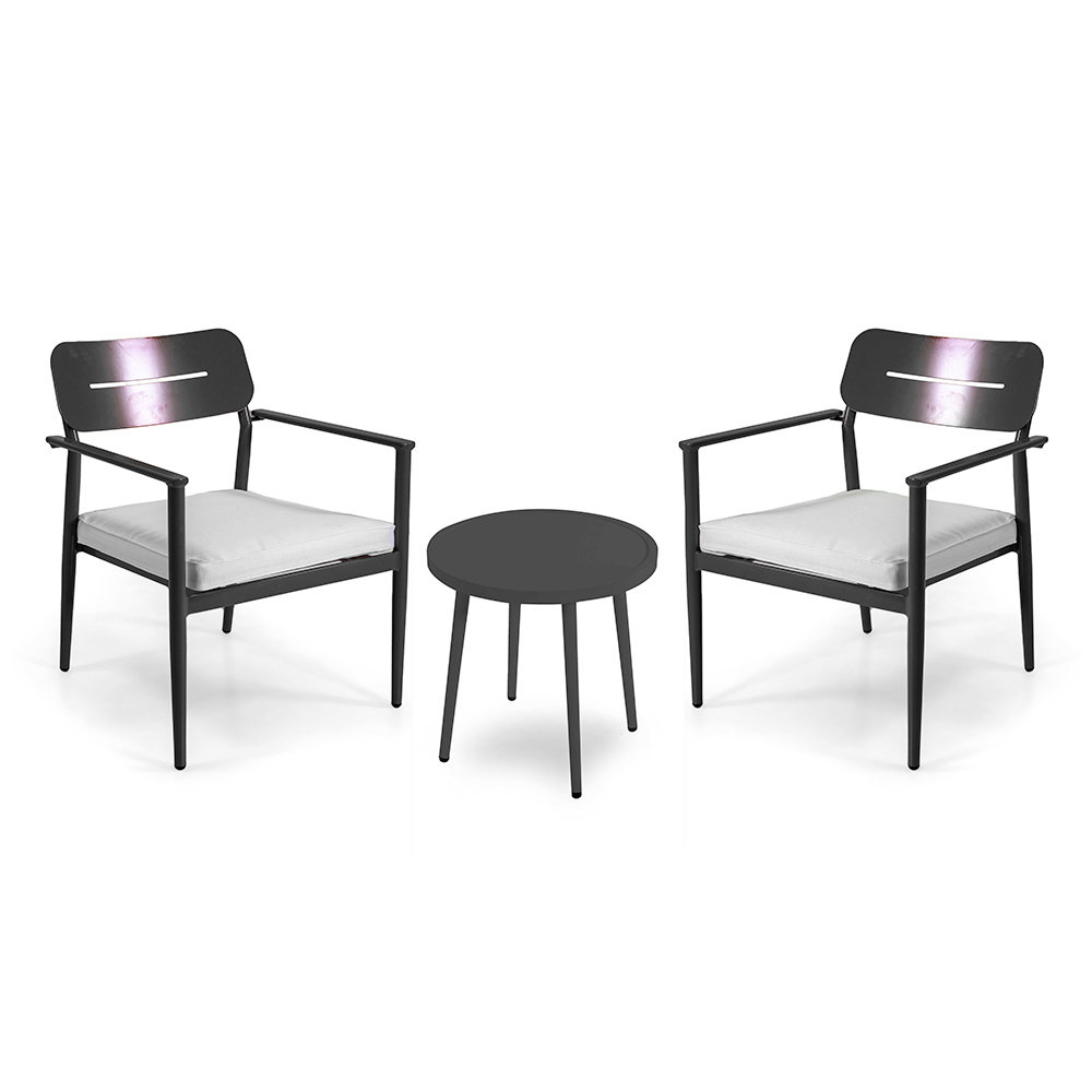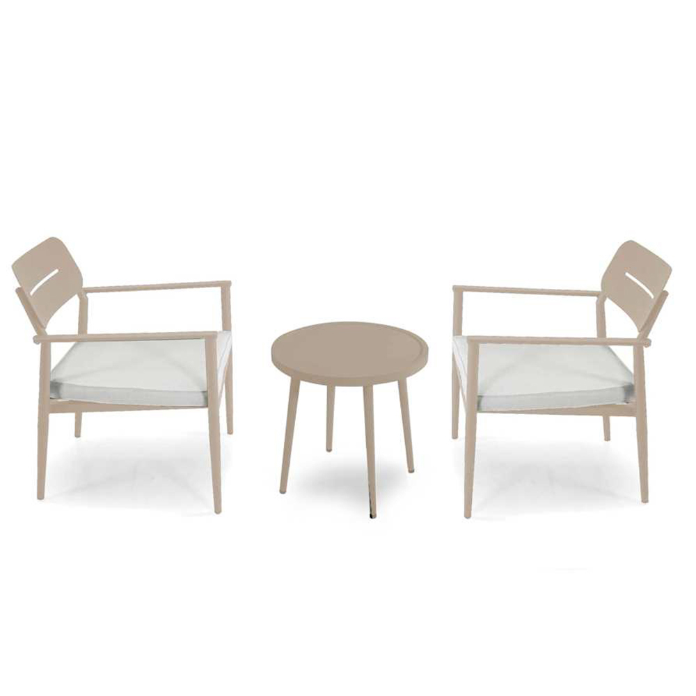 The coordinated table with its essential design completes the ensemble, offering a practical solution for placing drinks or books, making your outdoor space a true extension of the living area, ideal for moments of relaxation or for receiving guests.