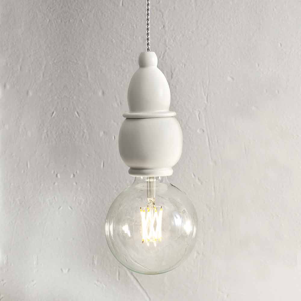 This lamp is able to furnish your rooms with style and elegance, creating striking light spots. It is available in different finishes that are divided into "classic enamels" or "lustre". The finishes belonging to this second category are made using an ancient ceramic technique where a layer of the following precious metals is spread by hand and then fired: 24 carat gold, 22 carat platinum and 90% copper title. Both finishing are available in glossy or matt versions. It has an electrified steel cable covered with a transparent silicone sheath. The lamp is supplied without a light bulb, but is well suited to decorative light bulbs on the market.