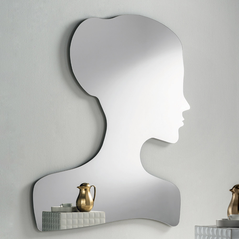 The mirror's shape reproduces the stylized profile of a female face , characterized by a gathered chignon , a slender neck , and exposed shoulders . This delicate silhouette creates an elegant and dramatic presence, transforming the mirror into a furnishing element with a strong visual impact.