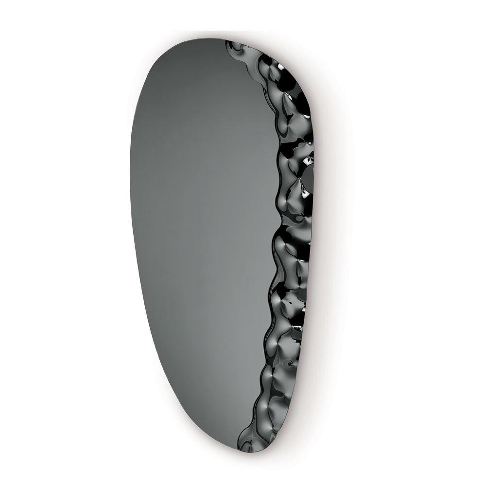 The mirror's distinctive feature is the presence of a lateral insert in tone-on-tone textured glass , creating a refined interplay of surfaces and textures. This decorative element appears to act as a base for the mirrored panel, generating a light and sophisticated visual effect that gives depth to the composition.