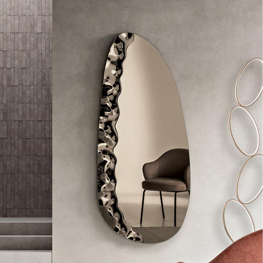 An elegant wall mirror designed in Italy , ideal for enhancing spaces such as the entrance , living room , or bedroom . Its contemporary design combines soft lines and textured details, transforming the mirror into a refined decorative element capable of elegantly enhancing the wall.